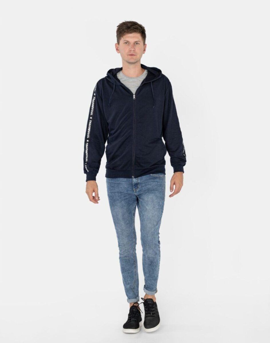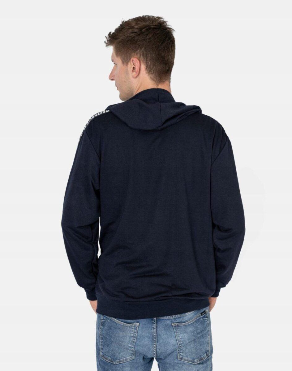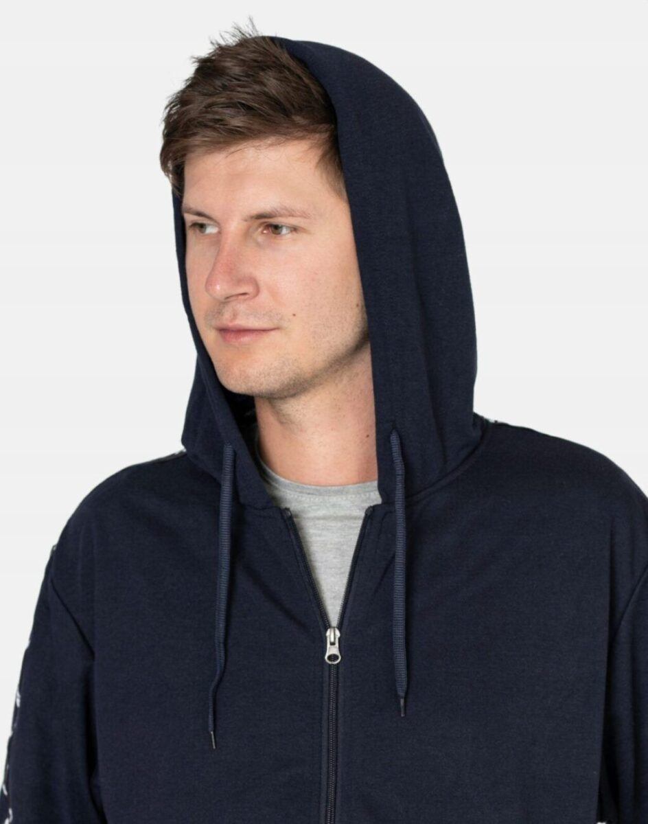 Bluza uszyta jest z cienkiej dzianiny dresowej bawełnianej z dodatkiem poliestru. Naturalna bawełna gwarantuje wchłanianie potu i oddychanie skóry, a sam materiał odznacza się dużą oddychalnością. Dodatek poliestru to gwarancja pełnej swobody ruchów oraz stabilności rozmiarów i koloru po wielokrotnym praniu. Bluza zasuwana jest w całości na zamek błyskawiczny, posiada dwie kieszenie przednie na dłonie i zintegrowany kaptur z możliwością regulacji jego wielkości i dopasowania. Dół bluzy oraz rękawy wykończone szerokim elastycznym ściągaczem. Możesz w niej chodzić na co dzień, idealnie nadaje się również do uprawiania różnych dyscyplin sportu i rekreacji. Niepodważalną zaletą bluzy jest możliwość noszenia jej w różnych warunkach pogodowych. Zapewniała ciepło i wygodę w czasie wietrznej pogody, a wraz ze wzrostem temperatury wystarczy rozpiąć zamek by poczuć się w niej komfortowo. Ergonomiczny krój bluzy nie ogranicza swobody ruchów, a właściwe dla odzieży sportowej proporcje surowcowe i niewielka gramatura wpływają pozytywnie na komfort użytkowania. Sportowa bluza bawełniana przyda Ci się przez cały rok: w zimie możesz nosić ją pod kurtką, a wiosną, jesienią i latem przyda się jako samodzielne lekkie okrycie w chłodniejsze lub wietrzne dni.
