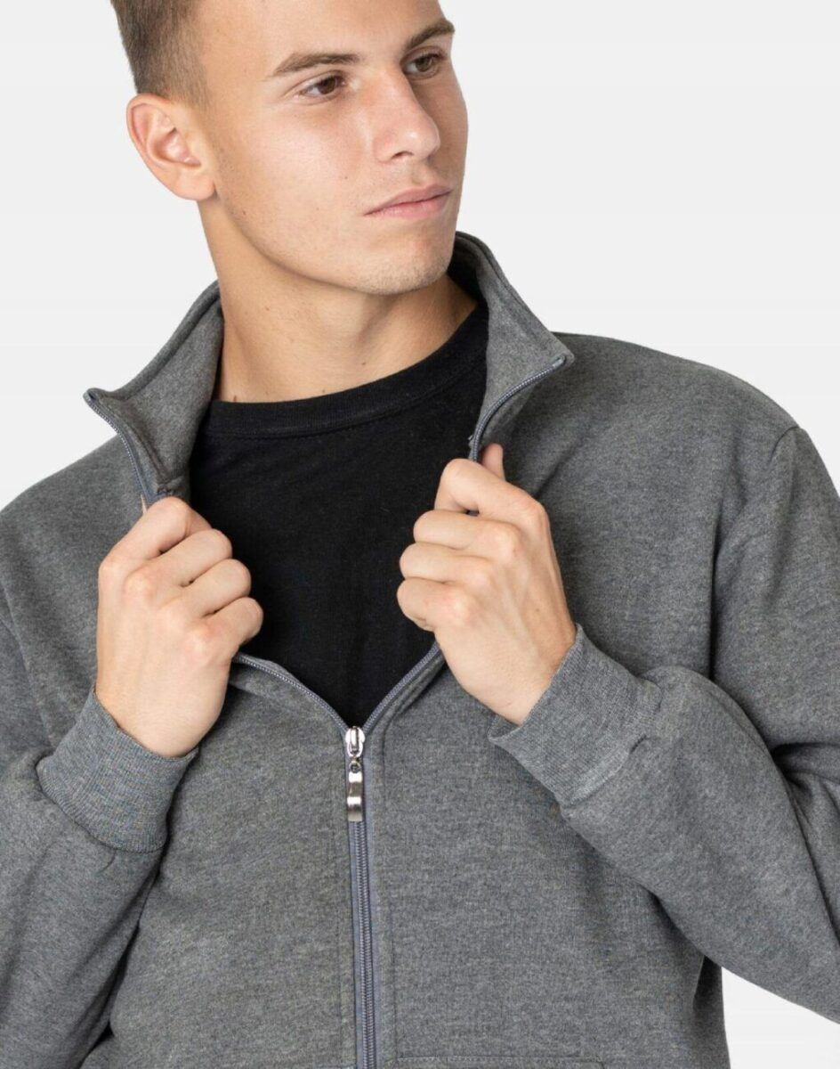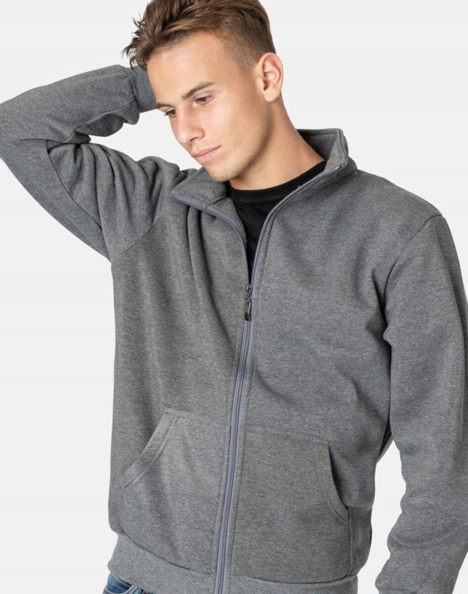 Klasyczna bluza sportowa męska wyprodukowana z dzianiny bawełnianej z dodatkiem poliestru zapewniającej maksymalną wygodę i komfort użytkowania. Naturalna bawełna gwarantuje wspaniałą izolację cieplną, wchłanianie potu i oddychanie skóry, a sam materiał odznacza się dużą miękkością. Dodatek poliestru to gwarancja pełnej swobody ruchów oraz stabilności rozmiarów i koloru po wielokrotnym praniu. Bluza zasuwana jest w całości na zamek błyskawiczny i posiada dwie kieszenie przednie na dłonie. Dół bluzy oraz rękawy wykończone szerokim elastycznym ściągaczem. Wewnętrzna strona posiada wykończenie typu „MESCH” (fabrycznie wykończona jest miłym w dotyku i przyjemnym dla ciała meszkiem tzw. „szczotkowana”) zapewniające bardzo przyjemny kontakt ze skórą oraz komfort cieplny. Zewnętrzna powierzchnia bluzy jest gładka. Ergonomiczny krój bluzy nie ogranicza swobody ruchów a właściwe dla odzieży sportowej proporcje surowcowe wpływają pozytywnie na komfort użytkowania. Możesz w niej chodzić na co dzień. Idealnie nadaje się również do uprawiania różnych dyscyplin sportu i rekreacji.