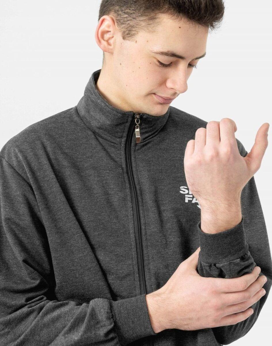 Bluza uszyta jest z cienkiej dzianiny dresowej bawełnianej z dodatkiem poliestru. Naturalna bawełna gwarantuje wchłanianie potu i oddychanie skóry a sam materiał odznacza się dużą oddychalnością. Dodatek poliestru to gwarancja pełnej swobody ruchów oraz stabilności rozmiarów i koloru po wielokrotnym praniu. Bluza zasuwana jest w całości na zamek błyskawiczny i posiada dwie kieszenie przednie na dłonie. Dół bluzy oraz rękawy wykończone szerokim elastycznym ściągaczem. Możesz w niej chodzić na co dzień, idealnie nadaje się również do uprawiania różnych dyscyplin sportu i rekreacji. Niepodważalną zaletą bluzy jest możliwość noszenia jej w różnych warunkach pogodowych. Zapewniała ciepło i wygodę w czasie wietrznej pogody a wraz ze wzrostem temperatury wystarczy rozpiąć zamek by poczuć się w niej komfortowo. Ergonomiczny krój bluzy nie ogranicza swobody ruchów a właściwe dla odzieży sportowej proporcje surowcowe i niewielka gramatura wpływają pozytywnie na komfort użytkowania. Sportowa bluza bawełniana przyda Ci się przez cały rok: w zimie możesz nosić ją pod kurtką, a wiosną, jesienią i latem przyda się jako samodzielne lekkie okrycie w chłodniejsze lub wietrzne dni. Uratuje cię w sytuacji, gdy nie będziesz miał czasu na wymyślanie, w co się ubrać.
