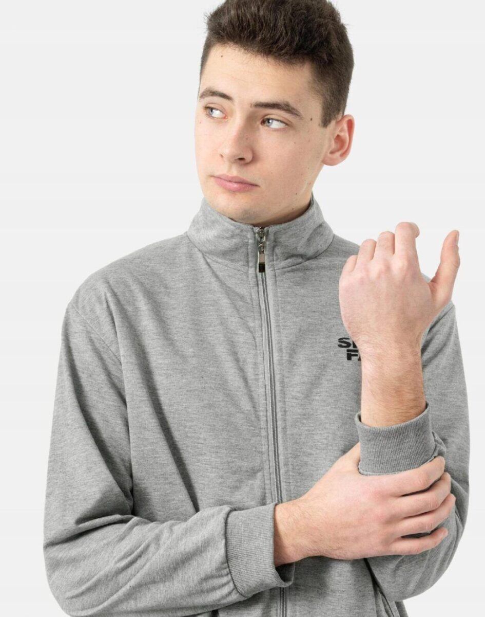 Bluza uszyta jest z cienkiej dzianiny dresowej bawełnianej z dodatkiem poliestru. Naturalna bawełna gwarantuje wchłanianie potu i oddychanie skóry a sam materiał odznacza się dużą oddychalnością. Dodatek poliestru to gwarancja pełnej swobody ruchów oraz stabilności rozmiarów i koloru po wielokrotnym praniu. Bluza zasuwana jest w całości na zamek błyskawiczny i posiada dwie kieszenie przednie na dłonie. Dół bluzy oraz rękawy wykończone szerokim elastycznym ściągaczem. Możesz w niej chodzić na co dzień, idealnie nadaje się również do uprawiania różnych dyscyplin sportu i rekreacji. Niepodważalną zaletą bluzy jest możliwość noszenia jej w różnych warunkach pogodowych. Zapewniała ciepło i wygodę w czasie wietrznej pogody a wraz ze wzrostem temperatury wystarczy rozpiąć zamek by poczuć się w niej komfortowo. Ergonomiczny krój bluzy nie ogranicza swobody ruchów a właściwe dla odzieży sportowej proporcje surowcowe i niewielka gramatura wpływają pozytywnie na komfort użytkowania. Sportowa bluza bawełniana przyda Ci się przez cały rok: w zimie możesz nosić ją pod kurtką, a wiosną, jesienią i latem przyda się jako samodzielne lekkie okrycie w chłodniejsze lub wietrzne dni. Uratuje cię w sytuacji, gdy nie będziesz miał czasu na wymyślanie, w co się ubrać.