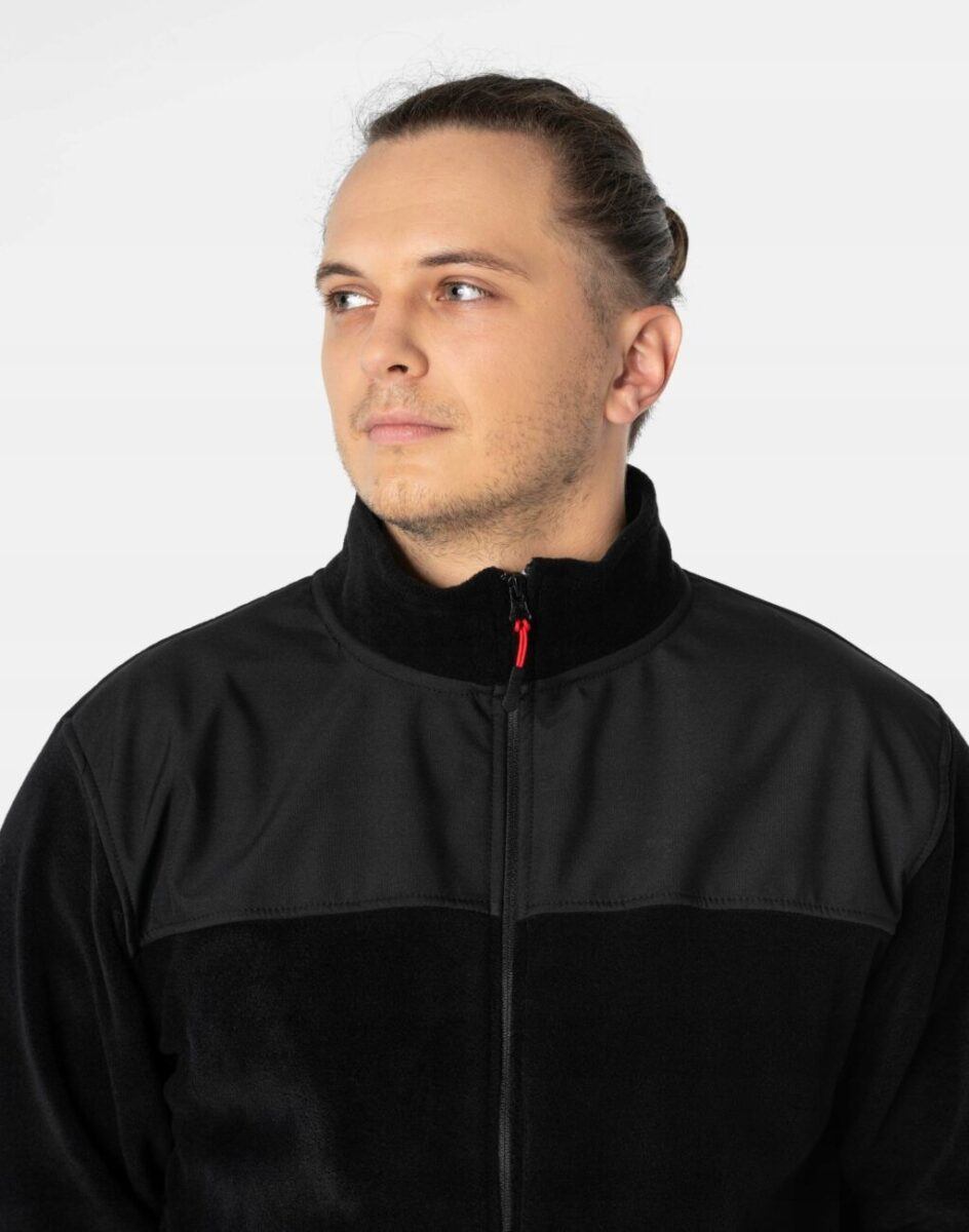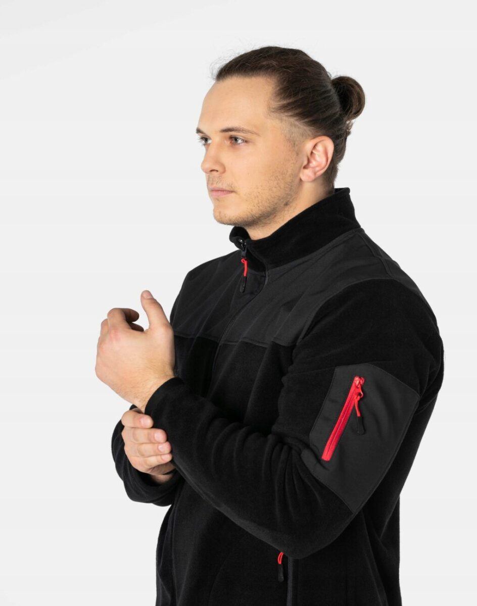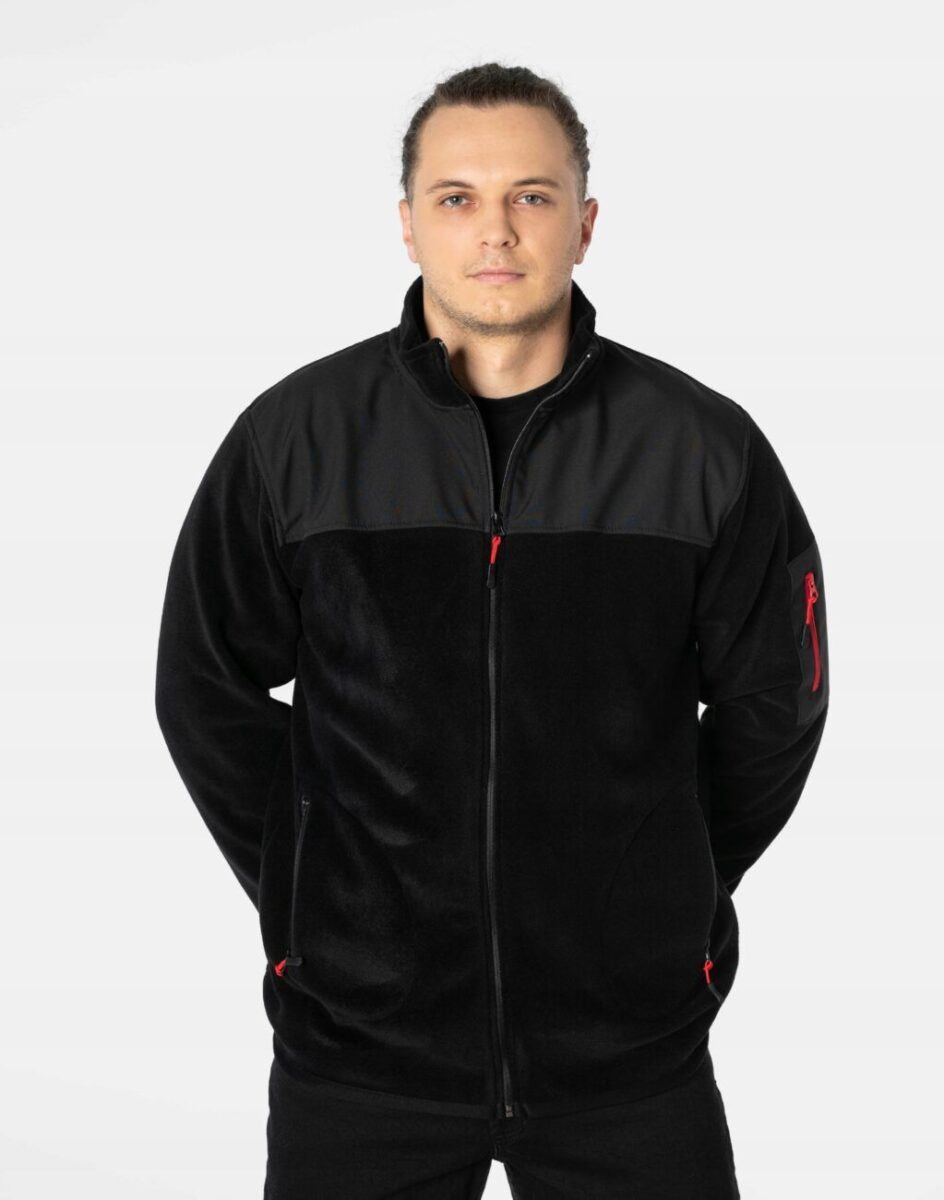 Bluza zasuwana jest w całości na wodoodporny zamek błyskawiczny i posiada dwie wpuszczane kieszenie na dłonie zasuwane na wodoodporne zamki. Na lewym rękawie znajduje się pionowa kieszonka zasuwana również na wodoodporny zamek błyskawiczny. Dół bluzy oraz rękawy wykończone są elastycznym mankietem, który zapobiega utracie ciepła. Długość do bioder z powodzeniem zakrywa części ciała wrażliwe na chłód jak plecy na wysokości nerek i pośladki. Ramiona oraz kieszeń na rękawie bluzy zostały wzmocnione dodatkowo wodoodpornym materiałem typu rip-stop w celu zwiększenia odporności na przetarcia i wodę. Bluza znakomicie sprawdzi się w chłodniejsze dni bo jest ciepła, wygodna i bardzo modna, a praktyczny wysoki kołnierz/stójka ochroni Twoją szyję przed zimnem i wiatrem, a często zastępuje nawet szalik co jest bardzo wygodne.