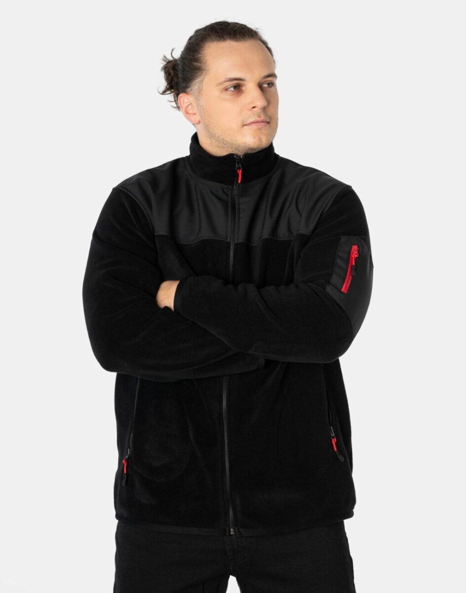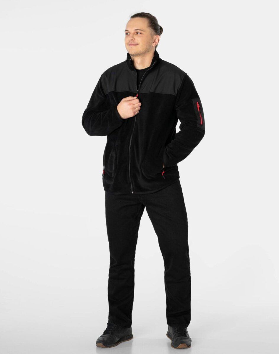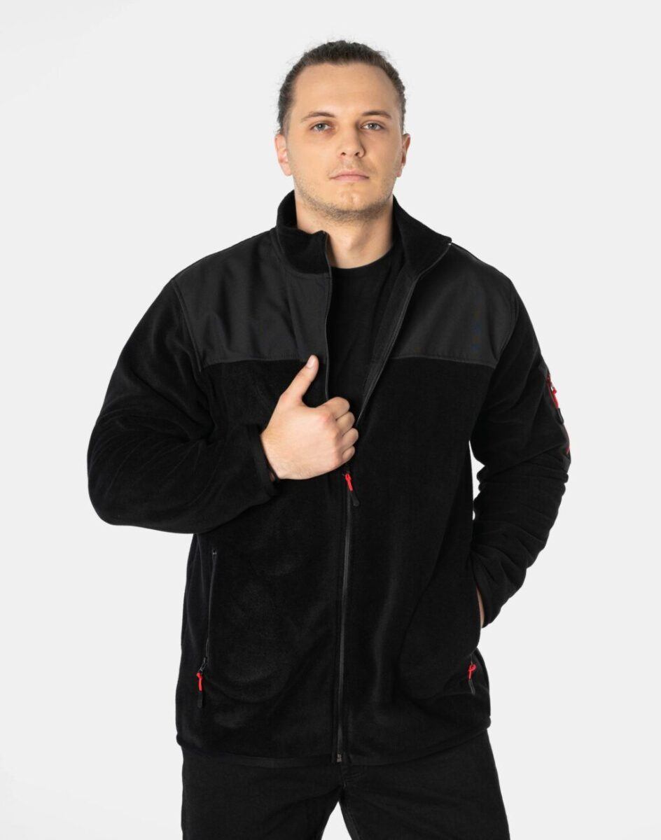 Bluza zasuwana jest w całości na wodoodporny zamek błyskawiczny i posiada dwie wpuszczane kieszenie na dłonie zasuwane na wodoodporne zamki. Na lewym rękawie znajduje się pionowa kieszonka zasuwana również na wodoodporny zamek błyskawiczny. Dół bluzy oraz rękawy wykończone są elastycznym mankietem, który zapobiega utracie ciepła. Długość do bioder z powodzeniem zakrywa części ciała wrażliwe na chłód jak plecy na wysokości nerek i pośladki. Ramiona oraz kieszeń na rękawie bluzy zostały wzmocnione dodatkowo wodoodpornym materiałem typu rip-stop w celu zwiększenia odporności na przetarcia i wodę. Bluza znakomicie sprawdzi się w chłodniejsze dni bo jest ciepła, wygodna i bardzo modna, a praktyczny wysoki kołnierz/stójka ochroni Twoją szyję przed zimnem i wiatrem, a często zastępuje nawet szalik co jest bardzo wygodne.