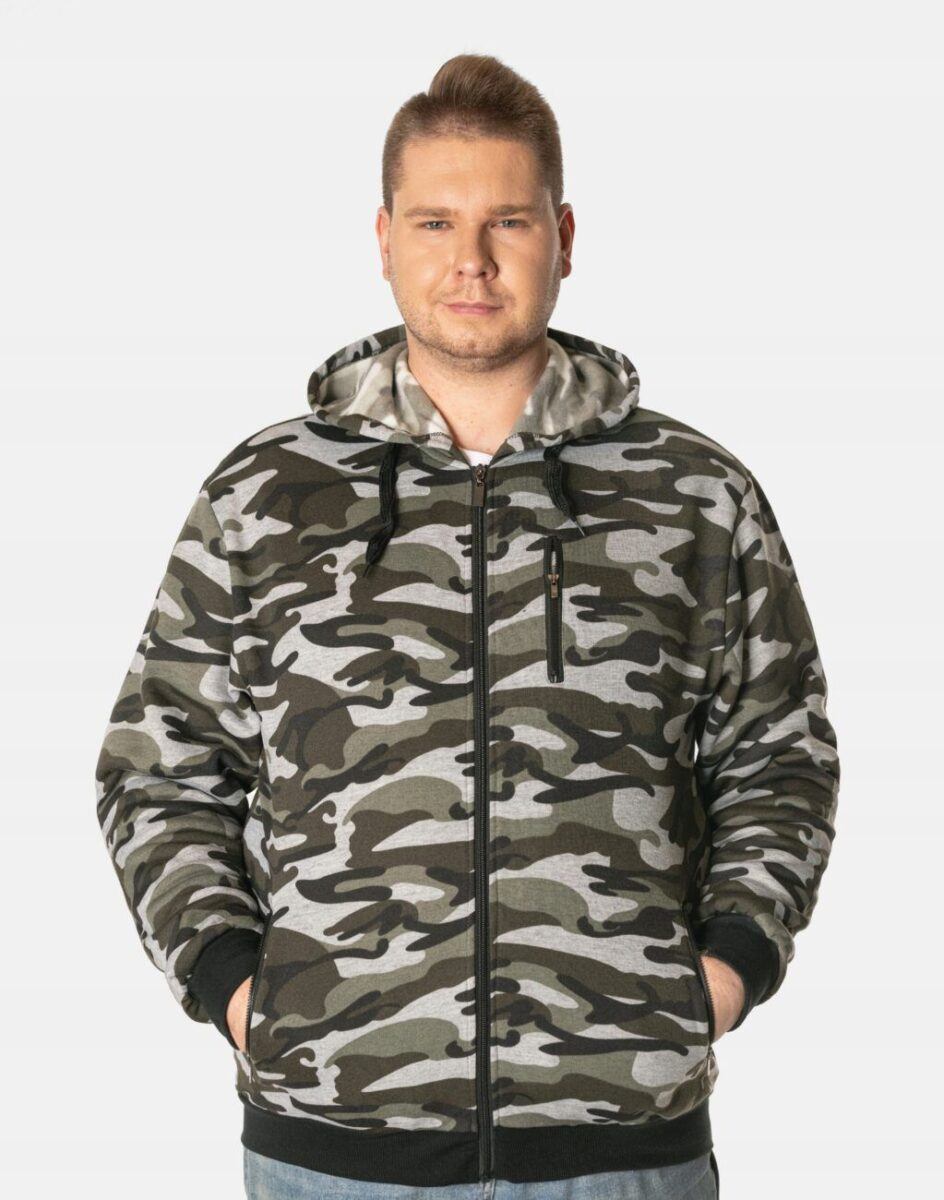 Bluza zasuwana jest w całości na zamek błyskawiczny i posiada dwie wpuszczane kieszenie na dłonie zasuwane również na eklery. Na lewej piersi znajduje się pionowa kieszeń zasuwana na zamek błyskawiczny. Rękawy i dół bluzy wykończone są szerokim elastycznym ściągaczem. Wykonana z wysokiej jakości dzianiny dresowej bawełnianej z dodatkiem poliestru. Naturalna bawełna gwarantuje izolację cieplną, wchłanianie potu i oddychanie skóry a dodatek poliestru to gwarancja pełnej swobody ruchów oraz stabilności rozmiarów i kolorów po wielokrotnym praniu. Ergonomiczny krój bluzy nie ogranicza swobody ruchów, a właściwe dla odzieży sportowej proporcje surowcowe i odpowiednia gramatura wpływają pozytywnie na komfort użytkowania. Wewnętrzna strona dzianiny posiada wykończenie typu „MESCH” (fabrycznie wykończona jest miłym w dotyku i przyjemnym dla ciała meszkiem tzw. „szczotkowana”) zapewniające bardzo przyjemny kontakt ze skórą oraz komfort cieplny. Zewnętrzna powierzchnia bluzy jest ozdobiona w deseń inspirowany wojskowym wzorem moro CAMO który znają wszyscy na świecie. Ten charakterystyczny wzór jest uwielbiany przez fanów i fanki militarnego stylu ubierania. Znakomicie sprawdzi się w chłodniejsze dni, a praktyczny kaptur z możliwością regulacji wielkości i dopasowania skutecznie ochroni Twoją głowę przed wiatrem i chłodem. Możesz w niej chodzić na co dzień, idealnie nadaje się również do uprawiania różnych dyscyplin sportu i rekreacji.