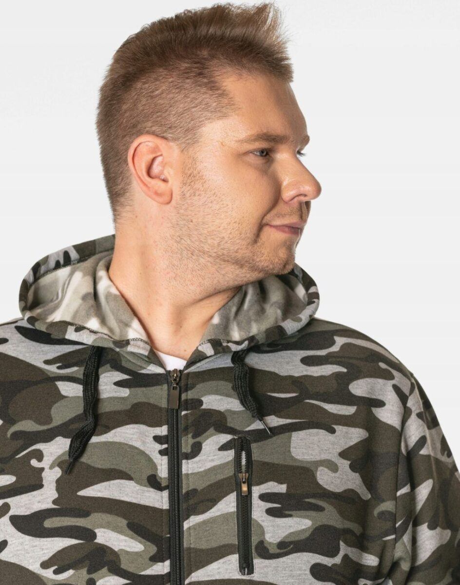 Bluza zasuwana jest w całości na zamek błyskawiczny i posiada dwie wpuszczane kieszenie na dłonie zasuwane również na eklery. Na lewej piersi znajduje się pionowa kieszeń zasuwana na zamek błyskawiczny. Rękawy i dół bluzy wykończone są szerokim elastycznym ściągaczem. Wykonana z wysokiej jakości dzianiny dresowej bawełnianej z dodatkiem poliestru. Naturalna bawełna gwarantuje izolację cieplną, wchłanianie potu i oddychanie skóry a dodatek poliestru to gwarancja pełnej swobody ruchów oraz stabilności rozmiarów i kolorów po wielokrotnym praniu. Ergonomiczny krój bluzy nie ogranicza swobody ruchów, a właściwe dla odzieży sportowej proporcje surowcowe i odpowiednia gramatura wpływają pozytywnie na komfort użytkowania. Wewnętrzna strona dzianiny posiada wykończenie typu „MESCH” (fabrycznie wykończona jest miłym w dotyku i przyjemnym dla ciała meszkiem tzw. „szczotkowana”) zapewniające bardzo przyjemny kontakt ze skórą oraz komfort cieplny. Zewnętrzna powierzchnia bluzy jest ozdobiona w deseń inspirowany wojskowym wzorem moro CAMO który znają wszyscy na świecie. Ten charakterystyczny wzór jest uwielbiany przez fanów i fanki militarnego stylu ubierania. Znakomicie sprawdzi się w chłodniejsze dni, a praktyczny kaptur z możliwością regulacji wielkości i dopasowania skutecznie ochroni Twoją głowę przed wiatrem i chłodem. Możesz w niej chodzić na co dzień, idealnie nadaje się również do uprawiania różnych dyscyplin sportu i rekreacji.