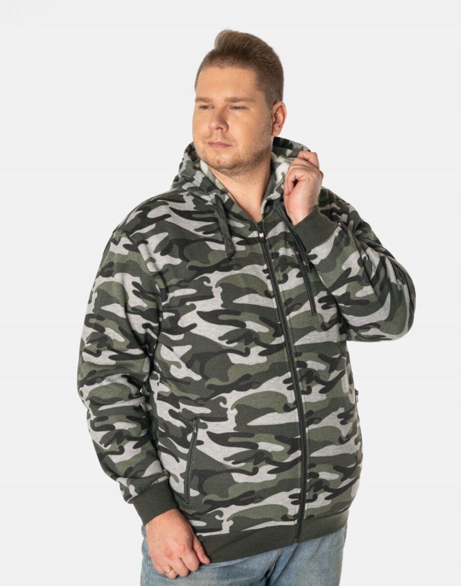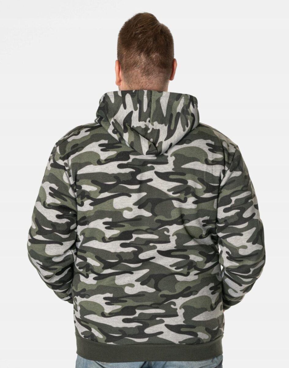 Bluza zasuwana jest w całości na zamek błyskawiczny i posiada dwie wpuszczane kieszenie na dłonie zasuwane również na eklery. Na lewej piersi znajduje się pionowa kieszeń zasuwana na zamek błyskawiczny. Rękawy i dół bluzy wykończone są szerokim elastycznym ściągaczem. Wykonana z wysokiej jakości dzianiny dresowej bawełnianej z dodatkiem poliestru. Naturalna bawełna gwarantuje izolację cieplną, wchłanianie potu i oddychanie skóry a dodatek poliestru to gwarancja pełnej swobody ruchów oraz stabilności rozmiarów i kolorów po wielokrotnym praniu. Ergonomiczny krój bluzy nie ogranicza swobody ruchów, a właściwe dla odzieży sportowej proporcje surowcowe i odpowiednia gramatura wpływają pozytywnie na komfort użytkowania. Wewnętrzna strona dzianiny posiada wykończenie typu „MESCH” (fabrycznie wykończona jest miłym w dotyku i przyjemnym dla ciała meszkiem tzw. „szczotkowana”) zapewniające bardzo przyjemny kontakt ze skórą oraz komfort cieplny. Zewnętrzna powierzchnia bluzy jest ozdobiona w deseń inspirowany wojskowym wzorem moro CAMO który znają wszyscy na świecie. Ten charakterystyczny wzór jest uwielbiany przez fanów i fanki militarnego stylu ubierania. Znakomicie sprawdzi się w chłodniejsze dni, a praktyczny kaptur z możliwością regulacji wielkości i dopasowania skutecznie ochroni Twoją głowę przed wiatrem i chłodem. Możesz w niej chodzić na co dzień, idealnie nadaje się również do uprawiania różnych dyscyplin sportu i rekreacji.