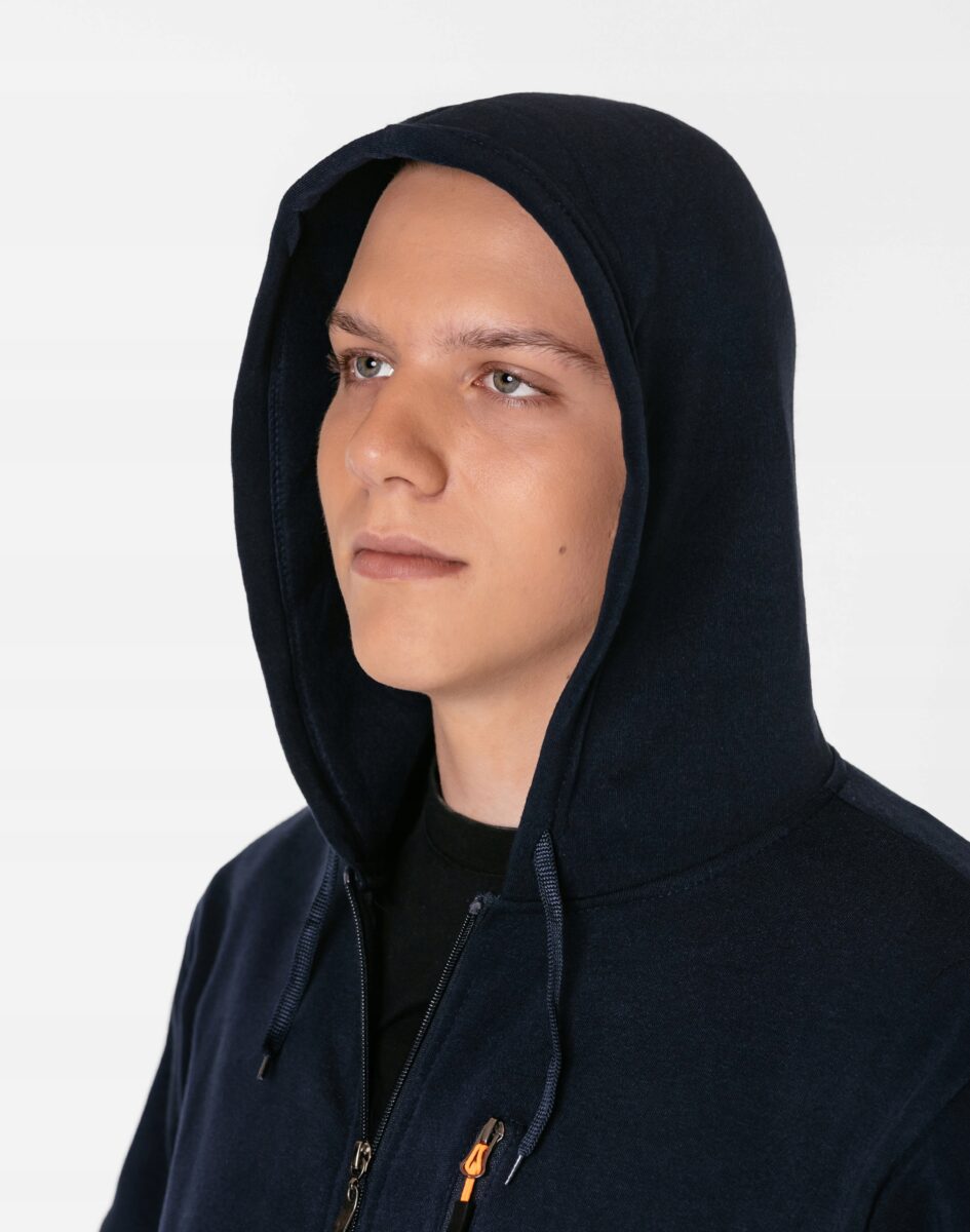 Bluza zasuwana jest w całości na zamek błyskawiczny i posiada dwie wpuszczane kieszenie na dłonie zasuwane na zamki błyskawiczne, pionową kieszonkę na lewej piersi zasuwaną na zamek, dwie duże wewnętrzne naszywane kieszenie na telefon, portfel, dokumenty itp. Dół bluzy oraz rękawy wykończone są szerokim elastycznym ściągaczem, co pozwala na precyzyjne dopasowanie bluzy do ciała i zapobiega utracie ciepła. Długość midi która z powodzeniem zakrywa części ciała wrażliwe na chłód jak plecy na wysokości nerek i pośladki. Znakomicie sprawdzi się w chłodniejsze dni, a praktyczny kaptur z możliwością regulacji wielkości i dopasowania skutecznie ochroni Twoją głowę przed wiatrem i chłodem. Możesz w niej chodzić na co dzień, idealnie nadaje się również do uprawiania różnych dyscyplin sportu i rekreacji.
