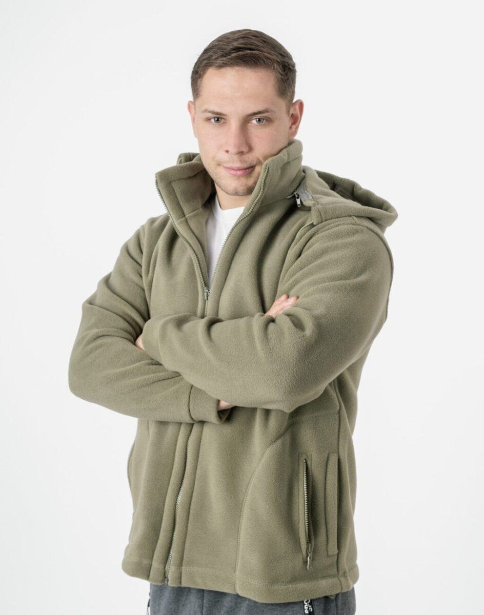 Bluza zasuwana jest w całości na zamek błyskawiczny. Posiada dwie wpuszczane kieszenie na dłonie i dwie zasuwane na eklery. Rękaw długi zakończony  szerokim mankietem. Wysoki kołnierz/stójka skutecznie chroni podbródek i szyję a często zastępuje nawet szalik co jest bardzo wygodne. Ściągacze regulacyjne na dole bluzy z gumką i stoperem pozwalają na precyzyjne dopasowanie bluzy do ciała co znacznie zapobiega utracie ciepła. Znakomicie sprawdzi się w chłodniejsze dni a ciepły, odpinany kaptur osłoni Twoją głowę przed wiatrem i chłodem.