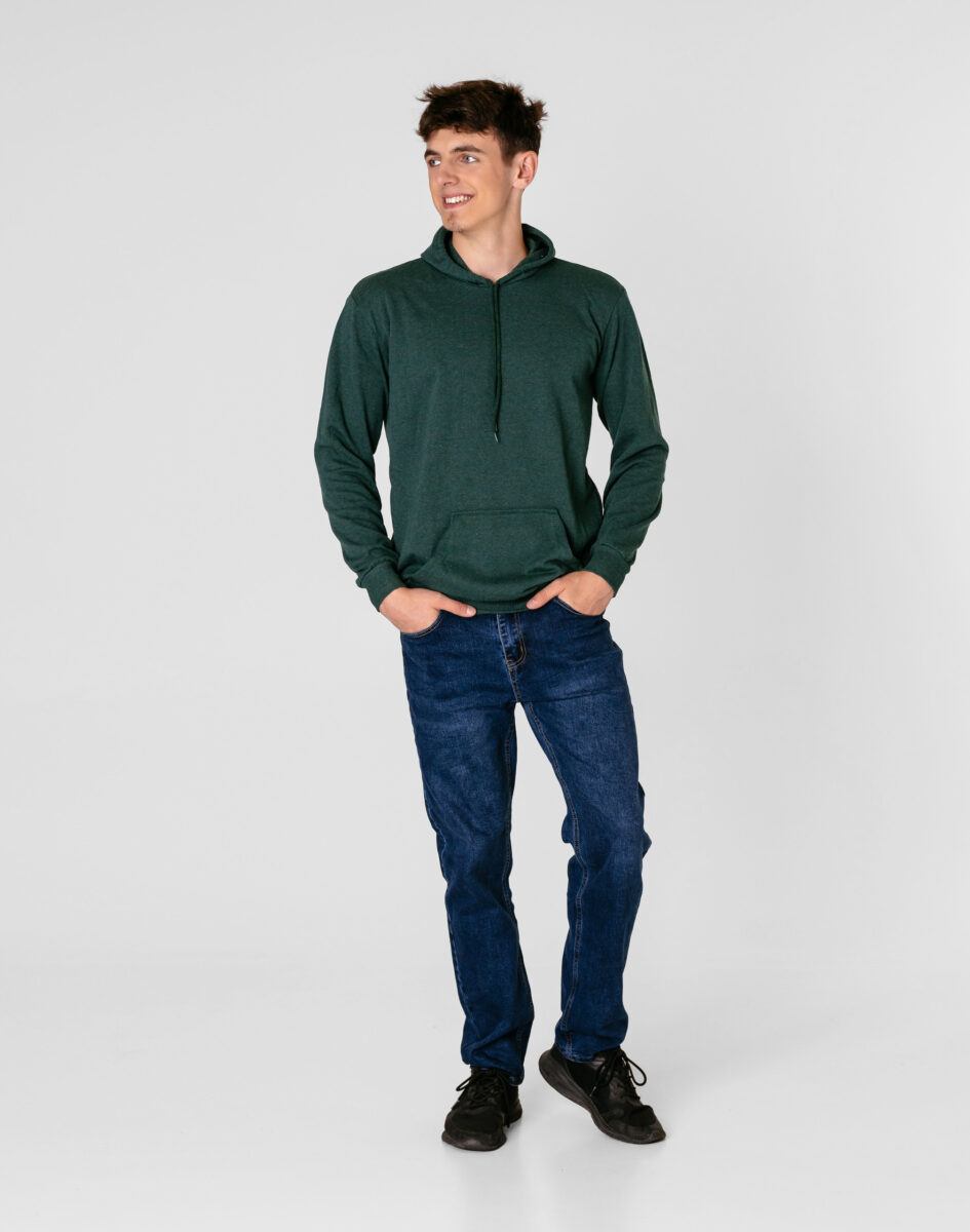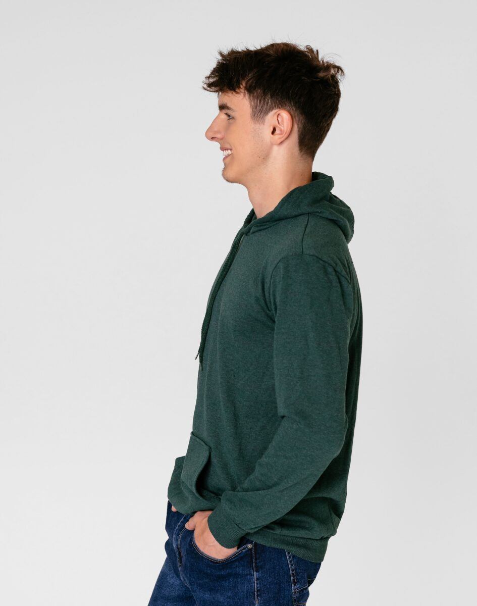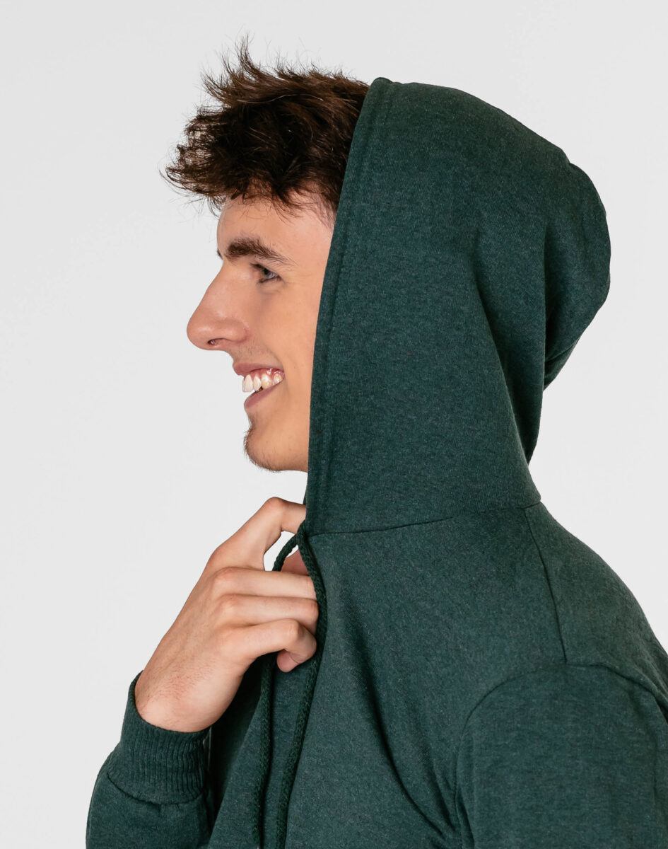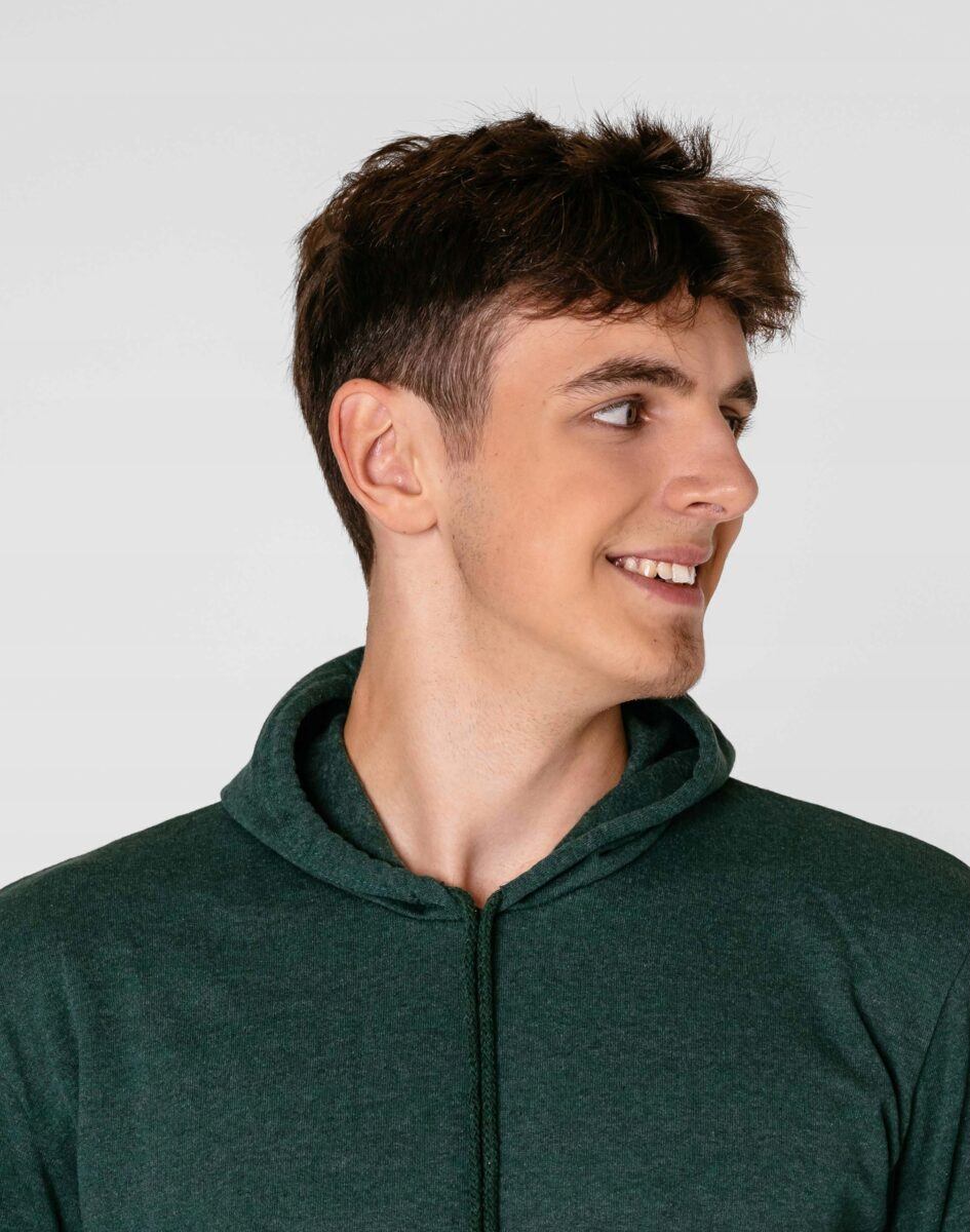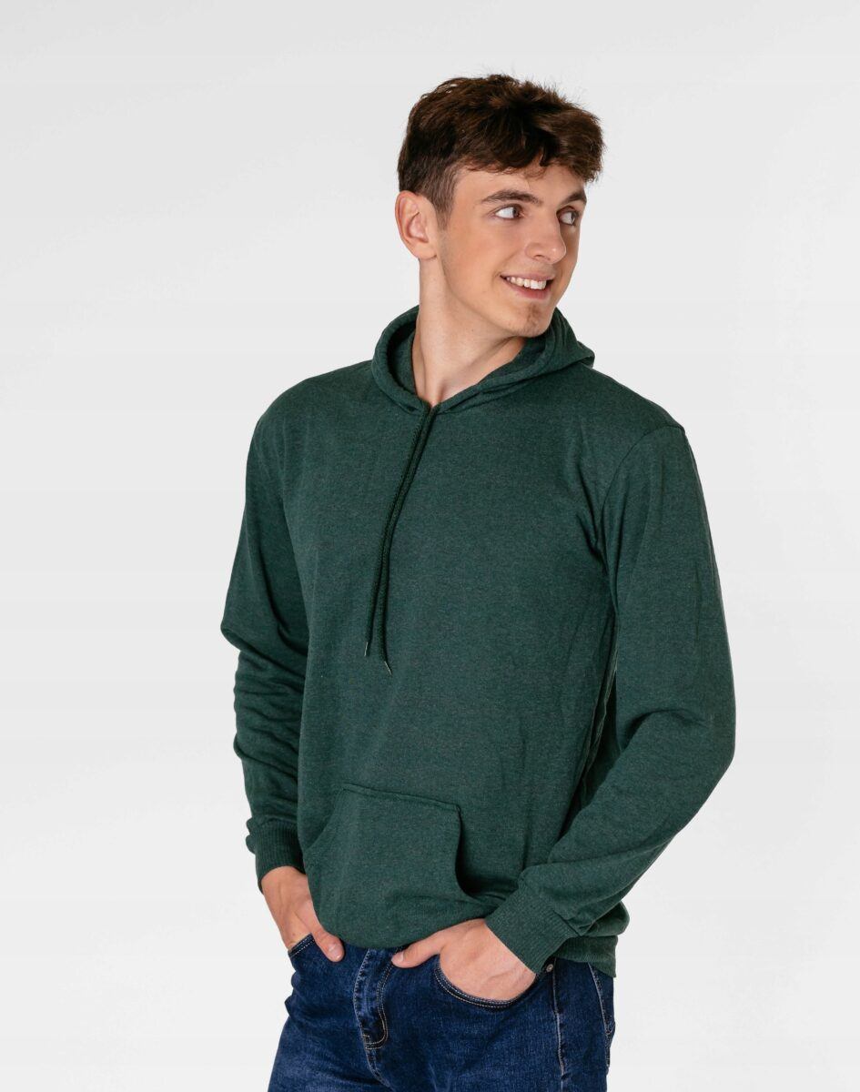 Sportowa bluza męska wyprodukowana z bawełny organicznej, zapewniającej maksymalną wygodę i komfort użytkowania. Bawełna jest jednym z najlepiej oddychających i przyjaznych dla skóry materiałów. Jest przewiewna i lekka wyprodukowana z naturalnych materiałów, co sprawia iż gwarantuje dobre właściwości higroskopijne, izolację cieplną, świetnie pochłania pot i wodę, odprowadza je z powierzchni skóry przez co jest bardzo przyjemna w noszeniu. To z kolei sprawia, iż wilgotne ubrania nie przywierają do ciała i pozwalają skórze oddychać. Sam materiał jest wyjątkowo gładki, nie uczula i odznacza się dużą miękkością. Wysoka jakość zastosowanej do produkcji dzianiny to także gwarancja pełnej swobody ruchów oraz stabilności rozmiarów i kolorów po wielokrotnym praniu. Klasyczna, gładka, wkładana przez głowę, posiada podwójną wygodną kieszeń tak zwaną „kangurkę” i zintegrowany kaptur z możliwością regulacji wielkości i dopasowania taśmowym ściągaczem. Dół bluzy oraz rękawy wykończone szerokim elastycznym ściągaczem co pozwala na precyzyjne dopasowanie bluzy do ciała i zapobiega utracie ciepła. Długość midi, która z powodzeniem zakrywa części ciała wrażliwe na chłód jak plecy na wysokości nerek. Wewnętrzna strona bluzy posiada wykończenie typu „MESCH” (fabrycznie wykończona jest miłym w dotyku i przyjemnym dla ciała meszkiem tzw. „szczotkowana”) zapewniające bardzo przyjemny kontakt ze skórą oraz komfort cieplny. Ergonomiczny krój bluzy nie ogranicza swobody ruchów co wpływa pozytywnie na wygodę użytkowania. Możesz w niej chodzić na co dzień, idealnie nadaje się również do uprawiania różnych dyscyplin sportu i rekreacji.