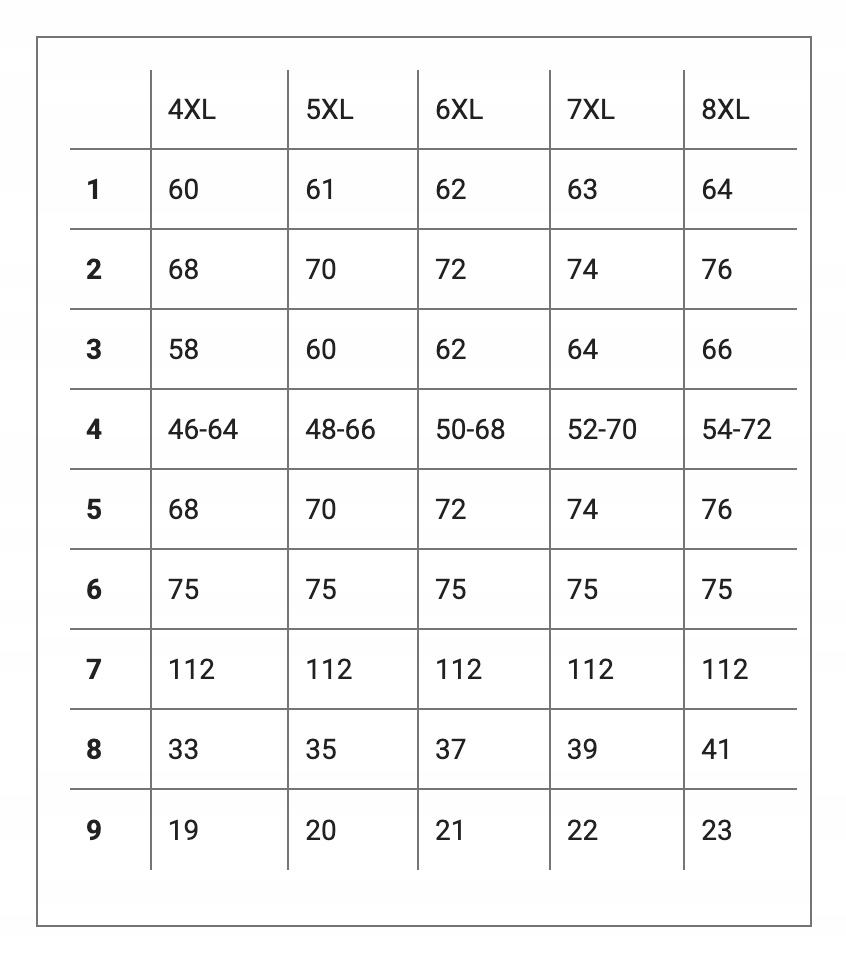 Proszę nie sugerować się rozmiarem podanym na metce przez producenta ( np: 4XL, 6XL czy 8XL) ponieważ różne firmy stosują bardzo różne oznaczenia rozmiaru na co my jako sprzedawcy na Allegro nie mamy żadnego wpływu. Najlepiej jest zmierzyć się dokładnie centymetrem a następnie porównać swoje wymiary z tabelą wymiarów podaną przez nas na aukcji i wybrać odpowiedni rozmiar.