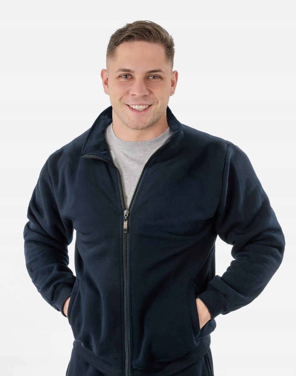 Ciepły komplet dresowy męski składający się z bluzy zasuwanej na zamek błyskawiczny i wygodnych sportowych spodni z klasyczną prostą nogawką. Wykonany z dzianiny dresowej bawełnianej o gramaturze 320 g/m2 z dodatkiem poliestru, miękkiej i ciepłej dostosowanej do użytku w zmiennych warunkach i niskiej temperaturze zapewniającej wysoki współczynnik ochrony termicznej w stosunku do wagi. Naturalna bawełna gwarantuje wspaniałą izolację cieplną, wchłanianie potu i oddychanie skóry a dodatek poliestru to gwarancja pełnej swobody ruchów oraz stabilności rozmiarów i koloru po wielokrotnym praniu. Wewnętrzna strona dzianiny posiada wykończenie typu "MESCH" (fabrycznie wykończona jest miłym w dotyku i przyjemnym dla ciała meszkiem tzw. "szczotkowana") zapewniające bardzo przyjemny kontakt ze skórą oraz komfort cieplny. Zewnętrzna powierzchnia dresu jest gładka.
