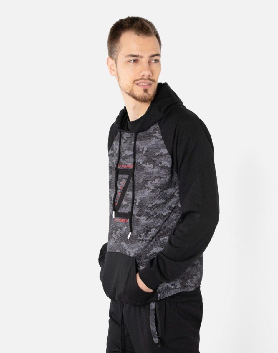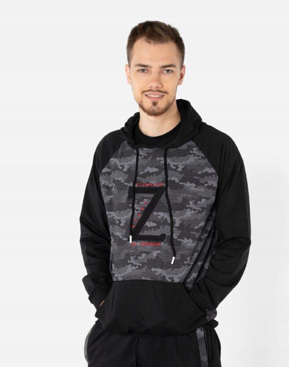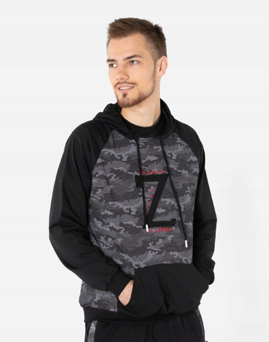 Wygodny komplet dresowy męski składający się ze sportowej bluzy z kapturem i wygodnych sportowych spodni ze zwężaną nogawką zakończoną ściągaczem. Wykonany z miłej w dotyku bawełnianej dzianiny dresowej o gramaturze 280 g/m2 z niewielkim dodatkiem lycry. Naturalna bawełna zapewnia przyjemny i miły kontakt z ciałem, wchłanianie potu i oddychanie skóry, a dodatek lycry to gwarancja pełnej swobody ruchów oraz stabilności rozmiarów i kolorów po wielokrotnym praniu. Ergonomiczny krój spodni i bluzy nie ogranicza swobody ruchów, a właściwe dla odzieży sportowej proporcje surowcowe i wysoka jakość dzianiny wpływają pozytywnie na komfort użytkowania.