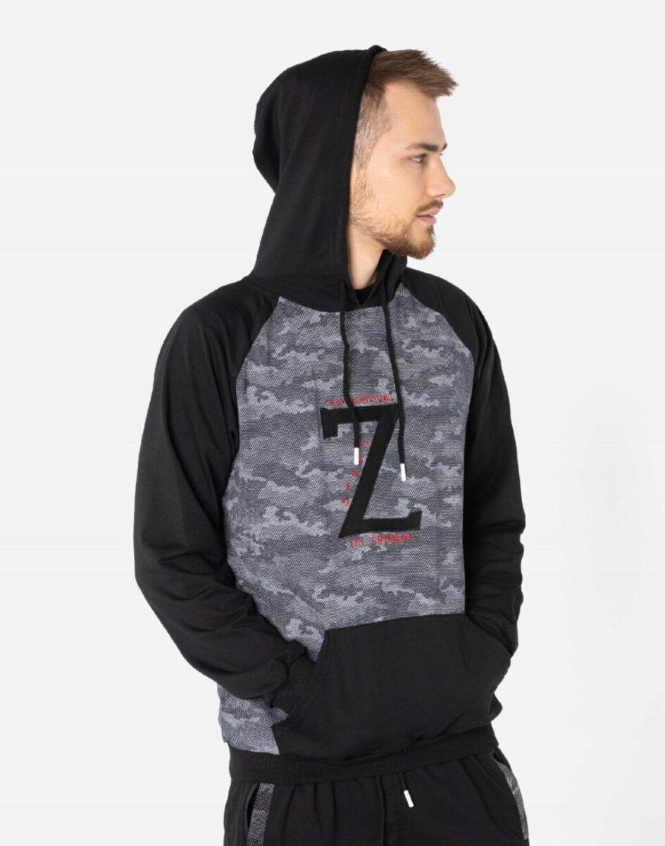 Wygodny komplet dresowy męski składający się ze sportowej bluzy z kapturem i wygodnych sportowych spodni ze zwężaną nogawką zakończoną ściągaczem. Wykonany z miłej w dotyku bawełnianej dzianiny dresowej o gramaturze 280 g/m2 z niewielkim dodatkiem lycry. Naturalna bawełna zapewnia przyjemny i miły kontakt z ciałem, wchłanianie potu i oddychanie skóry, a dodatek lycry to gwarancja pełnej swobody ruchów oraz stabilności rozmiarów i kolorów po wielokrotnym praniu. Ergonomiczny krój spodni i bluzy nie ogranicza swobody ruchów, a właściwe dla odzieży sportowej proporcje surowcowe i wysoka jakość dzianiny wpływają pozytywnie na komfort użytkowania.