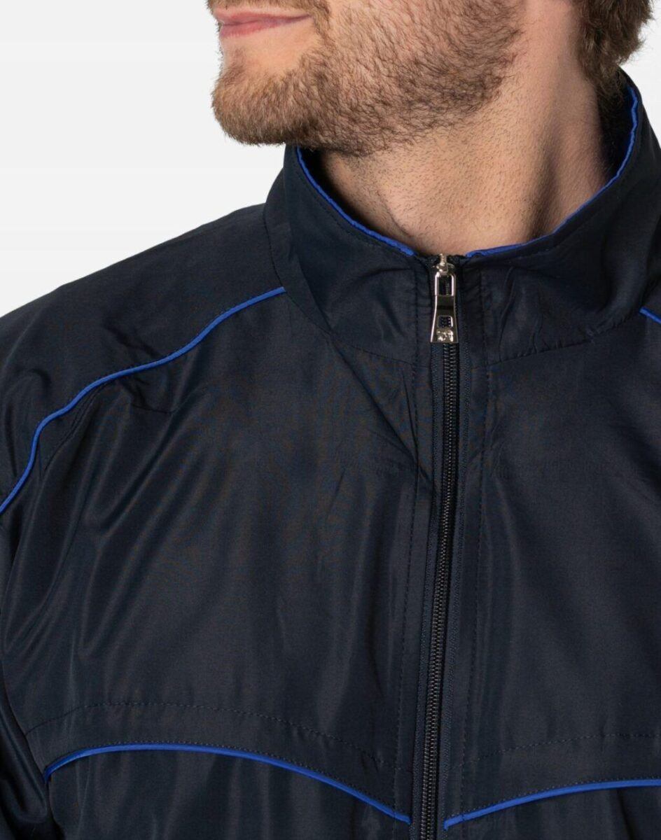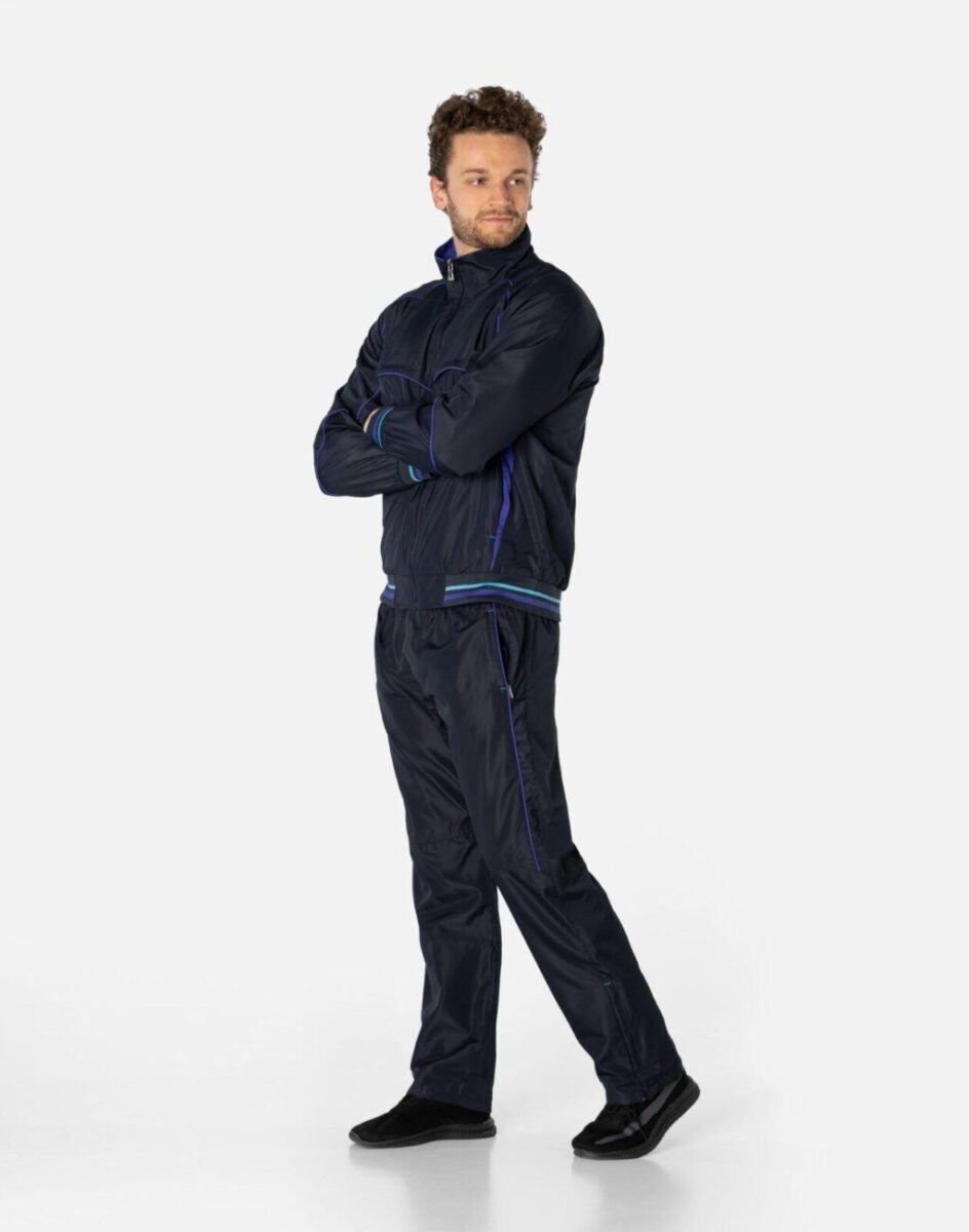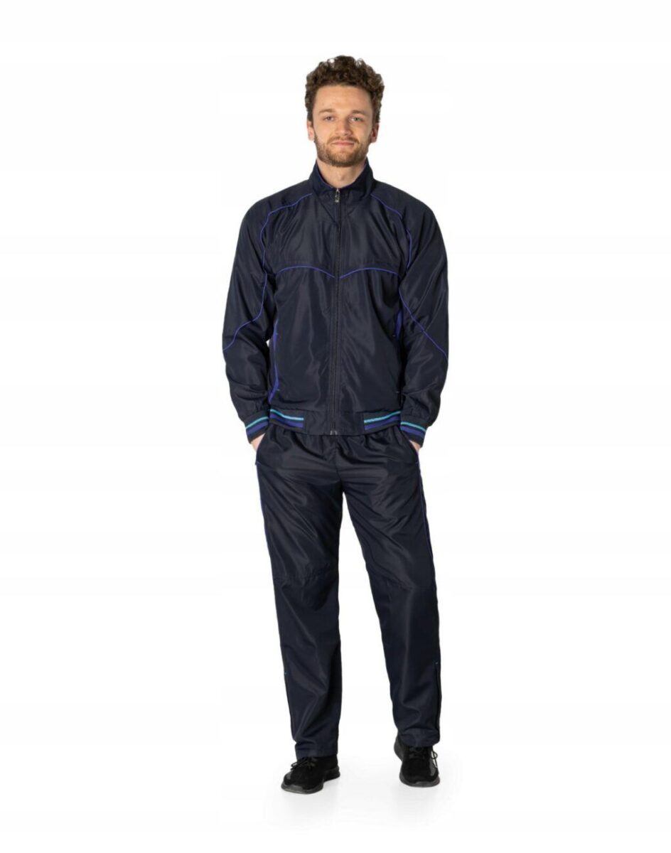 Wygodny komplet dresowy męski składający się z bluzy zasuwanej na zamek błyskawiczny i wygodnych sportowych spodni z klasyczną prostą nogawką. Doły nogawek rozsuwane z możliwością regulacji szerokości i dopasowania za pomocą krytego zamka. Wykonany z technicznej dresowej tkaniny o gramaturze 240 g/m2, która zapewnia przyjemny i miły kontakt z ciałem, odprowadzanie potu i oddychanie skóry oraz stabilność rozmiarów i kolorów po wielokrotnym praniu. Ergonomiczny krój spodni i bluzy nie ogranicza swobody ruchów, a odpowiednia dla odzieży sportowej gramatura wpływają pozytywnie na komfort użytkowania.