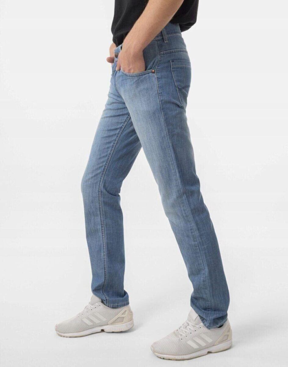 Jeansy męskie polskiej firmy HUNTER JEANS z modnym efektem sprania i przetarciami w nieśmiertelnym stylu „used-look”, w procesie produkcji poddane zostały specjalnym zabiegom postarzającym materiał, polegającym na wycieraniu, wypieraniu barwnika i tworzeniu efektownych przetarć. Uzyskane w ten sposób efektowne rozjaśnienia i wytarcia mają na celu wywołanie tak modnego efektu starych, długo noszonych jeansów. Wykonane z wysokiej jakości cienkiej ale mocnej tkaniny bawełnianej „Denim Light Blue” z dodatkiem streczu (lycra). Przewiewne i wygodne, idealne rozwiązanie na ciepłe i gorące dni oraz niezbędny element wakacyjnej garderoby oraz udanych wiosenno-letnich stylizacji dostosowanych do wysokich temperatur. Niewielki dodatek lycry sprawia, że spodnie są bardziej elastyczne co pozwala na pełną swobodę ruchów, daje komfort przy siadaniu i zapewnia ogromny komfort noszenia. Zapinane są na kryty zamek błyskawiczny i metalowy guzik sygnowany logiem firmy. Z przodu mają dwie kieszonki zaokrąglone oraz mniejszą kieszonkę tzw. bilonówkę, a na tyle klasyczne kieszenie naszywane jak w typowych spodniach jeansowych. W pasie szlufki umożliwiające stylizacje z paskiem. Najbardziej podatne na uszkodzenia miejsca wzmocnione są dodatkowymi przeszyciami oraz firmowymi nitami.
