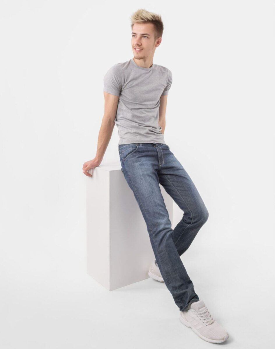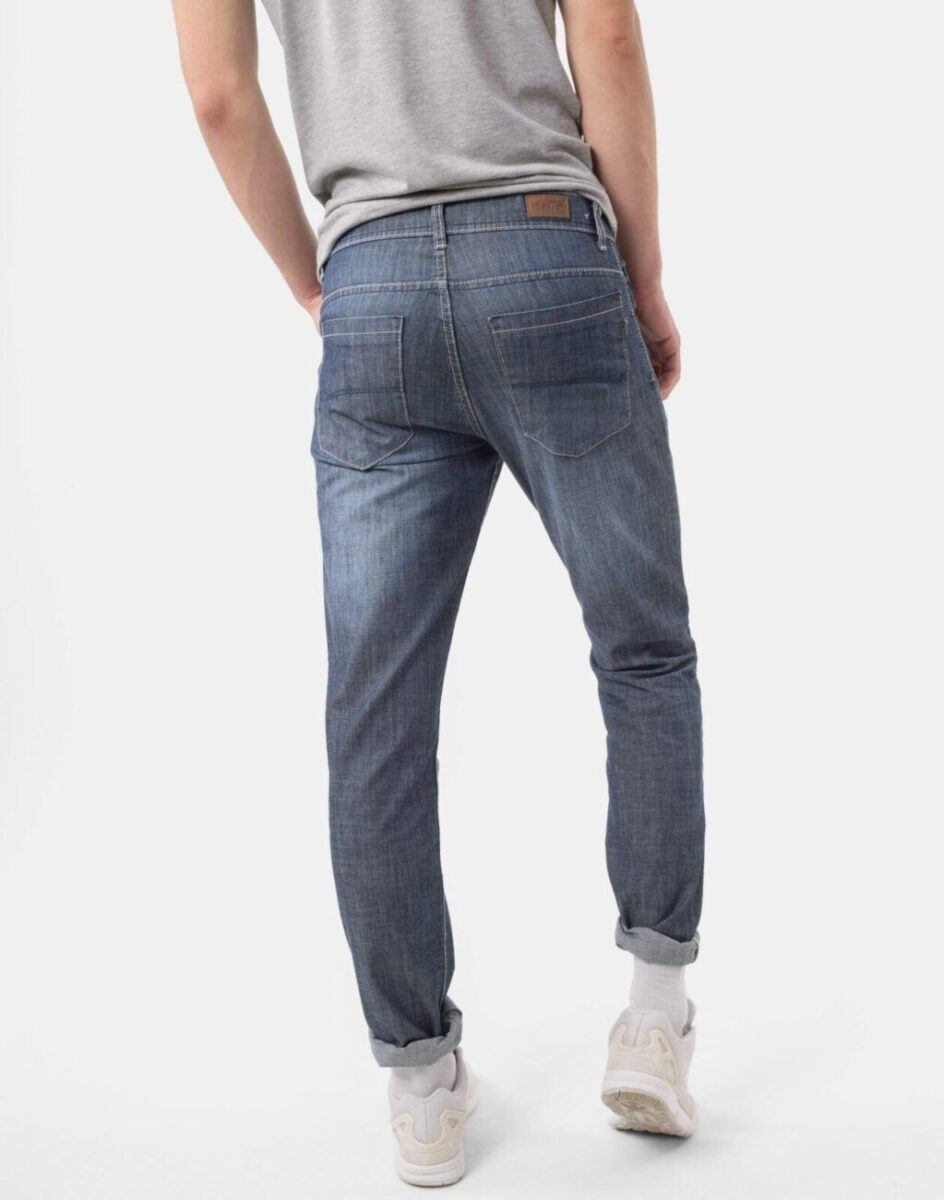 - Wzór: ozdobnie sprany Denim Jeans z fabrycznym efektem „used-look” – rozjaśnieniami iprzetarciami