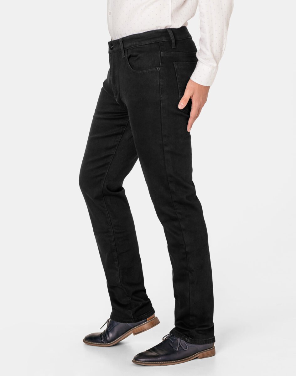Ciepłe spodnie jeansowe męskie w kolorze czarnym "Super Black" na jesień zimę z podwyższonym stanem i klasycznymi prostymi nogawkami, ocieplone od wewnętrznej strony polarem. Zapinane na zamek błyskawiczny i metalowy guzik sygnowany logiem firmy. Z przodu mają dwie kieszonki zaokrąglone oraz mniejszą kieszonkę tzw. bilonówkę, a na tyle klasyczne kieszenie naszywane jak w typowych spodniach jeansowych. W pasie szlufki umożliwiające stylizacje z paskiem. Najbardziej podatne na uszkodzenia miejsca wzmocnione są dodatkowymi przeszyciami i metalowymi nitami. Wykonane z wysokiej jakości, trwałej i mocnej, delikatnie elastycznej tkaniny jeansowej o jednolitym czarnym wybarwieniu "Super Black". Niewielki dodatek elastanu (lycra) sprawia, że spodnie są bardziej elastyczne, dobrze dopasowują się do sylwetki, i są bardzo komfortowe w użytkowaniu. Łatwo się je zakłada i są znacznie wygodniejsze od jeansów które lycry nie mają. Poza tym bawełna ma tendencję do kurczenia się w praniu dlatego lycra sprawia, że spodnie są wyjątkowo praktyczne i można je bez problemu założyć po wysuszeniu. Pozwalają na pełną swobodę ruchów, co daje wygodę przy siadaniu i zapewnia ogromny komfort noszenia.