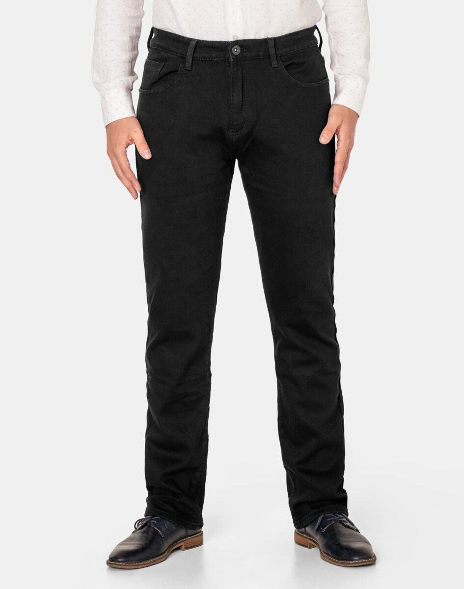 Ciepłe spodnie jeansowe męskie w kolorze czarnym "Super Black" na jesień zimę z podwyższonym stanem i klasycznymi prostymi nogawkami, ocieplone od wewnętrznej strony polarem. Zapinane na zamek błyskawiczny i metalowy guzik sygnowany logiem firmy. Z przodu mają dwie kieszonki zaokrąglone oraz mniejszą kieszonkę tzw. bilonówkę, a na tyle klasyczne kieszenie naszywane jak w typowych spodniach jeansowych. W pasie szlufki umożliwiające stylizacje z paskiem. Najbardziej podatne na uszkodzenia miejsca wzmocnione są dodatkowymi przeszyciami i metalowymi nitami. Wykonane z wysokiej jakości, trwałej i mocnej, delikatnie elastycznej tkaniny jeansowej o jednolitym czarnym wybarwieniu "Super Black". Niewielki dodatek elastanu (lycra) sprawia, że spodnie są bardziej elastyczne, dobrze dopasowują się do sylwetki, i są bardzo komfortowe w użytkowaniu. Łatwo się je zakłada i są znacznie wygodniejsze od jeansów które lycry nie mają. Poza tym bawełna ma tendencję do kurczenia się w praniu dlatego lycra sprawia, że spodnie są wyjątkowo praktyczne i można je bez problemu założyć po wysuszeniu. Pozwalają na pełną swobodę ruchów, co daje wygodę przy siadaniu i zapewnia ogromny komfort noszenia.