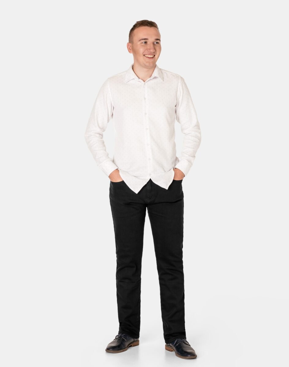 - Dwie wpuszczane kieszenie z przodu + bilonówka, dwie naszywane kieszenie z tyłu
