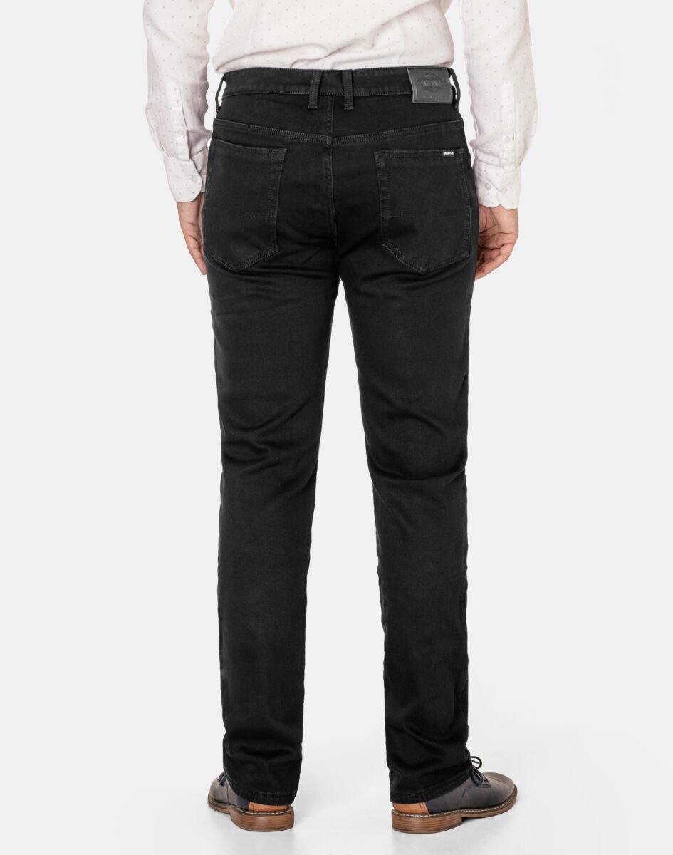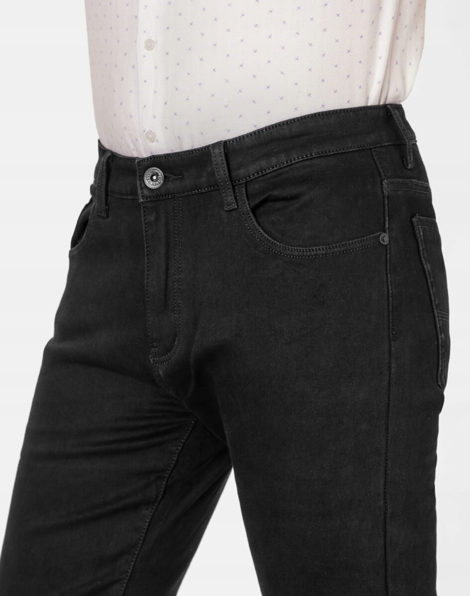 Ciepłe spodnie jeansowe męskie w kolorze czarnym "Super Black" na jesień zimę z podwyższonym stanem i klasycznymi prostymi nogawkami, ocieplone od wewnętrznej strony polarem. Zapinane na zamek błyskawiczny i metalowy guzik sygnowany logiem firmy. Z przodu mają dwie kieszonki zaokrąglone oraz mniejszą kieszonkę tzw. bilonówkę, a na tyle klasyczne kieszenie naszywane jak w typowych spodniach jeansowych. W pasie szlufki umożliwiające stylizacje z paskiem. Najbardziej podatne na uszkodzenia miejsca wzmocnione są dodatkowymi przeszyciami i metalowymi nitami. Wykonane z wysokiej jakości, trwałej i mocnej, delikatnie elastycznej tkaniny jeansowej o jednolitym czarnym wybarwieniu "Super Black". Niewielki dodatek elastanu (lycra) sprawia, że spodnie są bardziej elastyczne, dobrze dopasowują się do sylwetki, i są bardzo komfortowe w użytkowaniu. Łatwo się je zakłada i są znacznie wygodniejsze od jeansów które lycry nie mają. Poza tym bawełna ma tendencję do kurczenia się w praniu dlatego lycra sprawia, że spodnie są wyjątkowo praktyczne i można je bez problemu założyć po wysuszeniu. Pozwalają na pełną swobodę ruchów, co daje wygodę przy siadaniu i zapewnia ogromny komfort noszenia.
