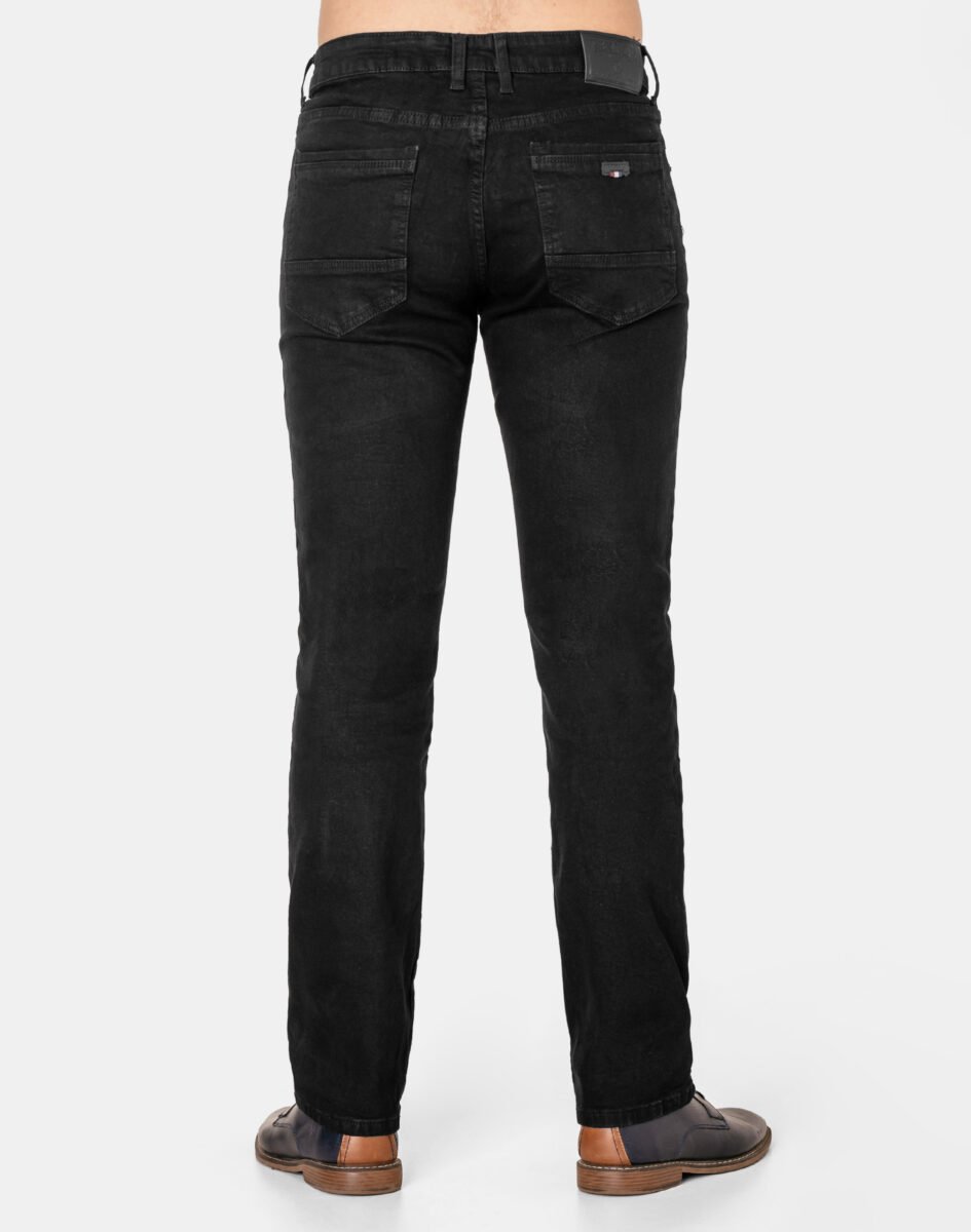 Ciepłe spodnie jeansowe męskie w kolorze czarnym "Super Black" na jesień zimę z podwyższonym stanem i klasycznymi prostymi nogawkami, ocieplone od wewnętrznej strony mikropolarem. Zapinane na kryty zamek błyskawiczny i metalowy guzik sygnowany logiem firmy. Z przodu mają dwie kieszonki zaokrąglone oraz mniejszą kieszonkę tzw. bilonówkę, a na tyle klasyczne kieszenie naszywane jak w typowych spodniach jeansowych. W pasie szlufki umożliwiające stylizacje z paskiem. Najbardziej podatne na uszkodzenia miejsca wzmocnione są dodatkowymi przeszyciami i metalowymi nitami. Wykonane z wysokiej jakości, trwałej i mocnej, delikatnie elastycznej tkaniny jeansowej o jednolitym czarnym wybarwieniu "Super Black". Niewielki dodatek elastanu (lycra) sprawia, że spodnie są bardziej elastyczne, dobrze dopasowują się do sylwetki, i są bardzo komfortowe w użytkowaniu. Łatwo się je zakłada i są znacznie wygodniejsze od jeansów które lycry nie mają. Poza tym bawełna ma tendencję do kurczenia się w praniu dlatego lycra sprawia, że spodnie są wyjątkowo praktyczne i można je bez problemu założyć po wysuszeniu. Pozwalają na pełną swobodę ruchów, co daje wygodę przy siadaniu i zapewnia ogromny komfort noszenia.