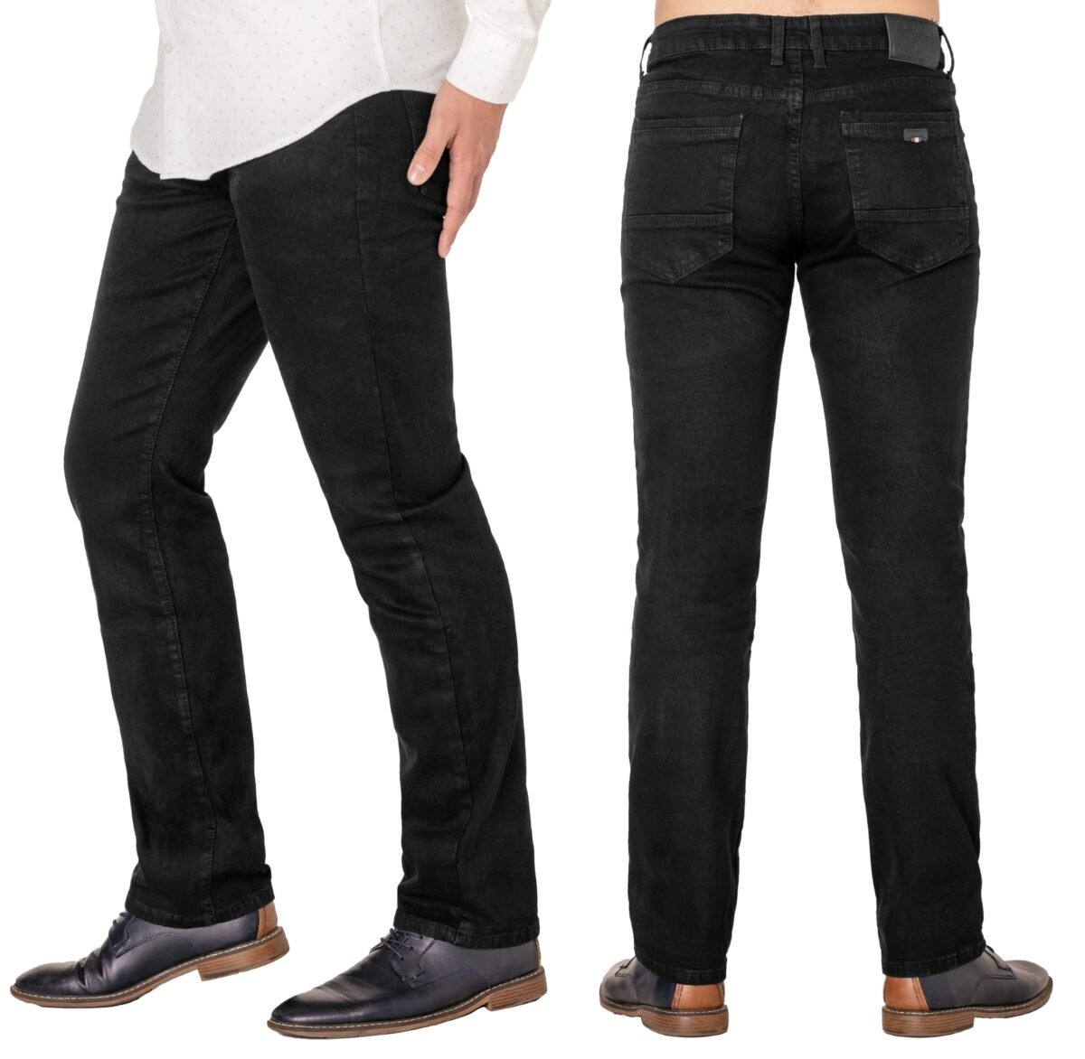 Ciepłe spodnie jeansowe męskie w kolorze czarnym "Super Black" na jesień zimę z podwyższonym stanem i klasycznymi prostymi nogawkami, ocieplone od wewnętrznej strony mikropolarem. Zapinane na kryty zamek błyskawiczny i metalowy guzik sygnowany logiem firmy. Z przodu mają dwie kieszonki zaokrąglone oraz mniejszą kieszonkę tzw. bilonówkę, a na tyle klasyczne kieszenie naszywane jak w typowych spodniach jeansowych. W pasie szlufki umożliwiające stylizacje z paskiem. Najbardziej podatne na uszkodzenia miejsca wzmocnione są dodatkowymi przeszyciami i metalowymi nitami. Wykonane z wysokiej jakości, trwałej i mocnej, delikatnie elastycznej tkaniny jeansowej o jednolitym czarnym wybarwieniu "Super Black". Niewielki dodatek elastanu (lycra) sprawia, że spodnie są bardziej elastyczne, dobrze dopasowują się do sylwetki, i są bardzo komfortowe w użytkowaniu. Łatwo się je zakłada i są znacznie wygodniejsze od jeansów które lycry nie mają. Poza tym bawełna ma tendencję do kurczenia się w praniu dlatego lycra sprawia, że spodnie są wyjątkowo praktyczne i można je bez problemu założyć po wysuszeniu. Pozwalają na pełną swobodę ruchów, co daje wygodę przy siadaniu i zapewnia ogromny komfort noszenia.