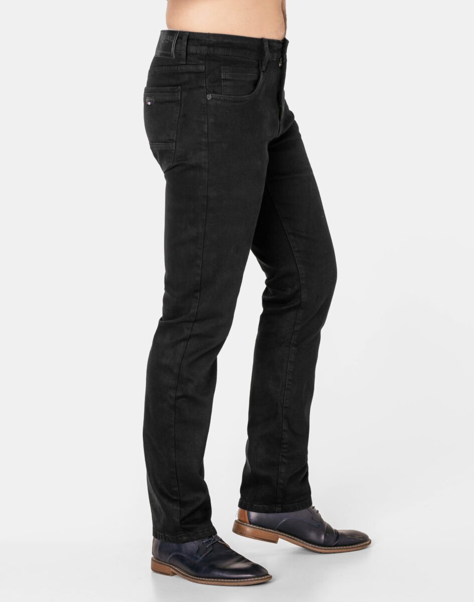 Ciepłe spodnie jeansowe męskie w kolorze czarnym "Super Black" na jesień zimę z podwyższonym stanem i klasycznymi prostymi nogawkami, ocieplone od wewnętrznej strony mikropolarem. Zapinane na kryty zamek błyskawiczny i metalowy guzik sygnowany logiem firmy. Z przodu mają dwie kieszonki zaokrąglone oraz mniejszą kieszonkę tzw. bilonówkę, a na tyle klasyczne kieszenie naszywane jak w typowych spodniach jeansowych. W pasie szlufki umożliwiające stylizacje z paskiem. Najbardziej podatne na uszkodzenia miejsca wzmocnione są dodatkowymi przeszyciami i metalowymi nitami. Wykonane z wysokiej jakości, trwałej i mocnej, delikatnie elastycznej tkaniny jeansowej o jednolitym czarnym wybarwieniu "Super Black". Niewielki dodatek elastanu (lycra) sprawia, że spodnie są bardziej elastyczne, dobrze dopasowują się do sylwetki, i są bardzo komfortowe w użytkowaniu. Łatwo się je zakłada i są znacznie wygodniejsze od jeansów które lycry nie mają. Poza tym bawełna ma tendencję do kurczenia się w praniu dlatego lycra sprawia, że spodnie są wyjątkowo praktyczne i można je bez problemu założyć po wysuszeniu. Pozwalają na pełną swobodę ruchów, co daje wygodę przy siadaniu i zapewnia ogromny komfort noszenia.