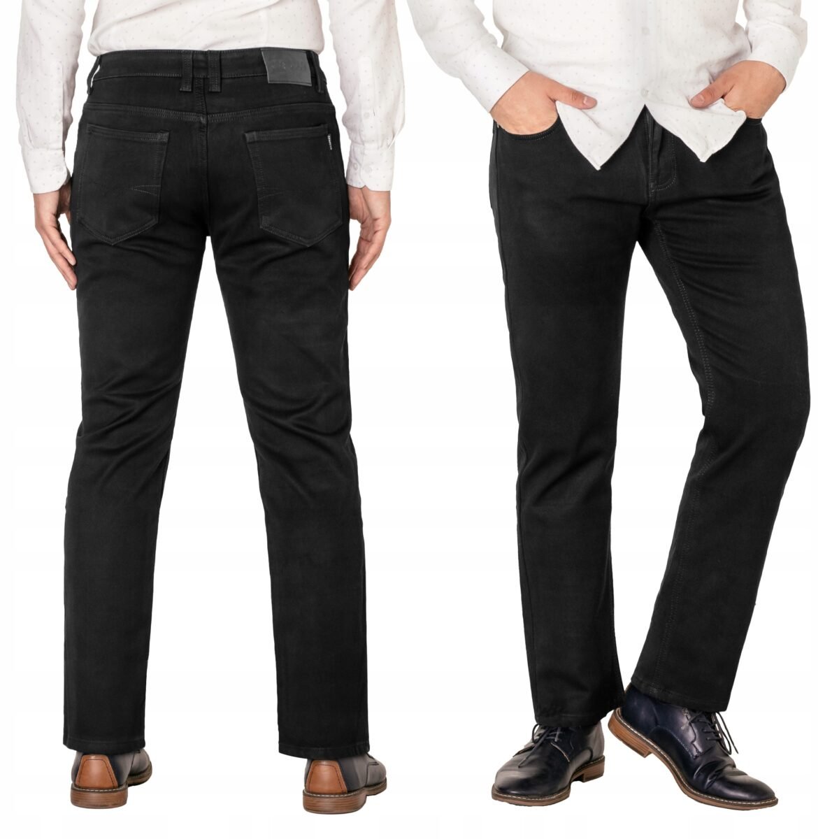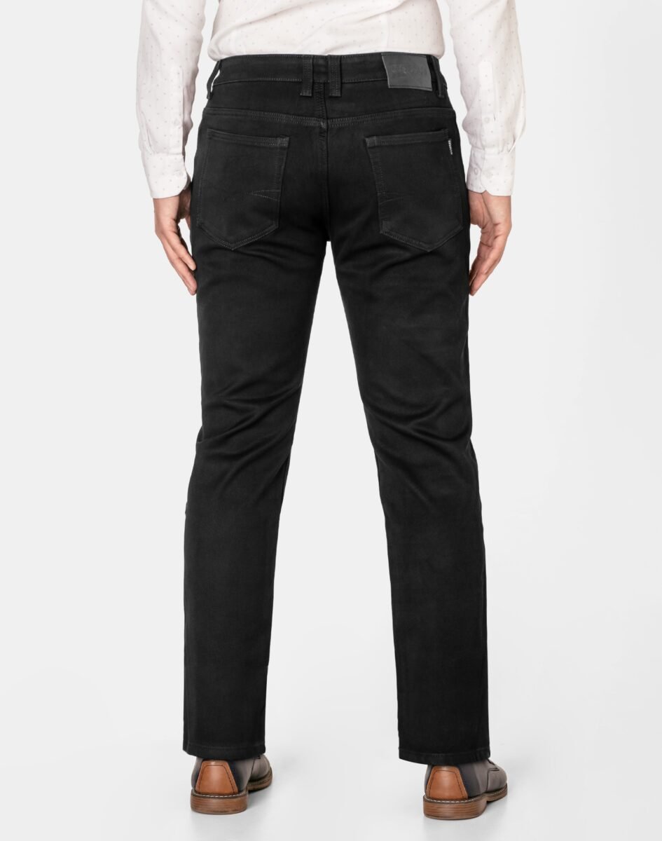 Ciepłe spodnie jeansowe męskie w kolorze czarnym "Super Black" na jesień zimę z podwyższonym stanem i klasycznymi prostymi nogawkami, ocieplone od wewnętrznej strony polarem. Zapinane na zamek błyskawiczny i metalowy guzik sygnowany logiem firmy. Z przodu mają dwie kieszonki zaokrąglone oraz mniejszą kieszonkę tzw. bilonówkę, a na tyle klasyczne kieszenie naszywane jak w typowych spodniach jeansowych. W pasie szlufki umożliwiające stylizacje z paskiem. Najbardziej podatne na uszkodzenia miejsca wzmocnione są dodatkowymi przeszyciami i metalowymi nitami. Wykonane z wysokiej jakości, trwałej i mocnej, delikatnie elastycznej tkaniny jeansowej o jednolitym czarnym wybarwieniu "Super Black". Niewielki dodatek PE (stretch) sprawia, że spodnie są bardziej elastyczne, dobrze dopasowują się do sylwetki, i są bardzo komfortowe w użytkowaniu. Łatwo się je zakłada i są znacznie wygodniejsze od jeansów które PE (stretch) nie mają. Poza tym bawełna ma tendencję do kurczenia się w praniu dlatego PE (stretch) sprawia, że spodnie są wyjątkowo praktyczne i można je bez problemu założyć po wysuszeniu. Pozwalają na pełną swobodę ruchów, co daje wygodę przy siadaniu i zapewnia ogromny komfort noszenia.
