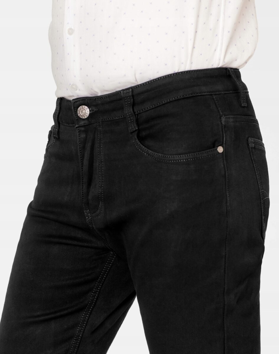 Ciepłe spodnie jeansowe męskie w kolorze czarnym "Super Black" na jesień zimę z podwyższonym stanem i klasycznymi prostymi nogawkami, ocieplone od wewnętrznej strony polarem. Zapinane na zamek błyskawiczny i metalowy guzik sygnowany logiem firmy. Z przodu mają dwie kieszonki zaokrąglone oraz mniejszą kieszonkę tzw. bilonówkę, a na tyle klasyczne kieszenie naszywane jak w typowych spodniach jeansowych. W pasie szlufki umożliwiające stylizacje z paskiem. Najbardziej podatne na uszkodzenia miejsca wzmocnione są dodatkowymi przeszyciami i metalowymi nitami. Wykonane z wysokiej jakości, trwałej i mocnej, delikatnie elastycznej tkaniny jeansowej o jednolitym czarnym wybarwieniu "Super Black". Niewielki dodatek PE (stretch) sprawia, że spodnie są bardziej elastyczne, dobrze dopasowują się do sylwetki, i są bardzo komfortowe w użytkowaniu. Łatwo się je zakłada i są znacznie wygodniejsze od jeansów które PE (stretch) nie mają. Poza tym bawełna ma tendencję do kurczenia się w praniu dlatego PE (stretch) sprawia, że spodnie są wyjątkowo praktyczne i można je bez problemu założyć po wysuszeniu. Pozwalają na pełną swobodę ruchów, co daje wygodę przy siadaniu i zapewnia ogromny komfort noszenia.