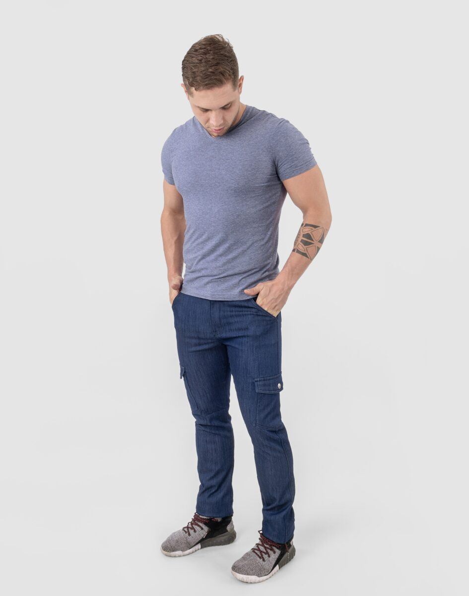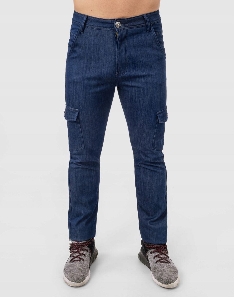Uszyte z solidnej i mocnej tkaniny bawełnianej z niewielkim dodatkiem elastanu o gęstym zapewniającym dużą wytrzymałość splocie, co zwiększa odporność na uszkodzenia mechaniczne oraz szybkość transportu wilgoci z powierzchni ciała na zewnątrz. Z przodu mają dwie klasyczne wpuszczanie kieszenie na dłonie a z tyłu dwie duże kieszenie naszywane jak w typowych spodniach jeansowych. Na udach 2 duże naszywane kieszenie transportowe typu Cargo kryte patką zapinaną na napy. Precyzyjne dopasowanie w pasie zapewniają szlufki umożliwiające stylizacje z paskiem. Uszyte z mocnego denimu z niewielkim dodatkiem elastanu, dzięki czemu spodnie są bardziej elastyczne, co pozwala na pełną swobodę ruchów, daje komfort przy siadaniu i zapewnia ogromny komfort noszenia. Najbardziej podatne na uszkodzenia miejsca wzmocnione są dodatkowymi podwójnymi przeszyciami.