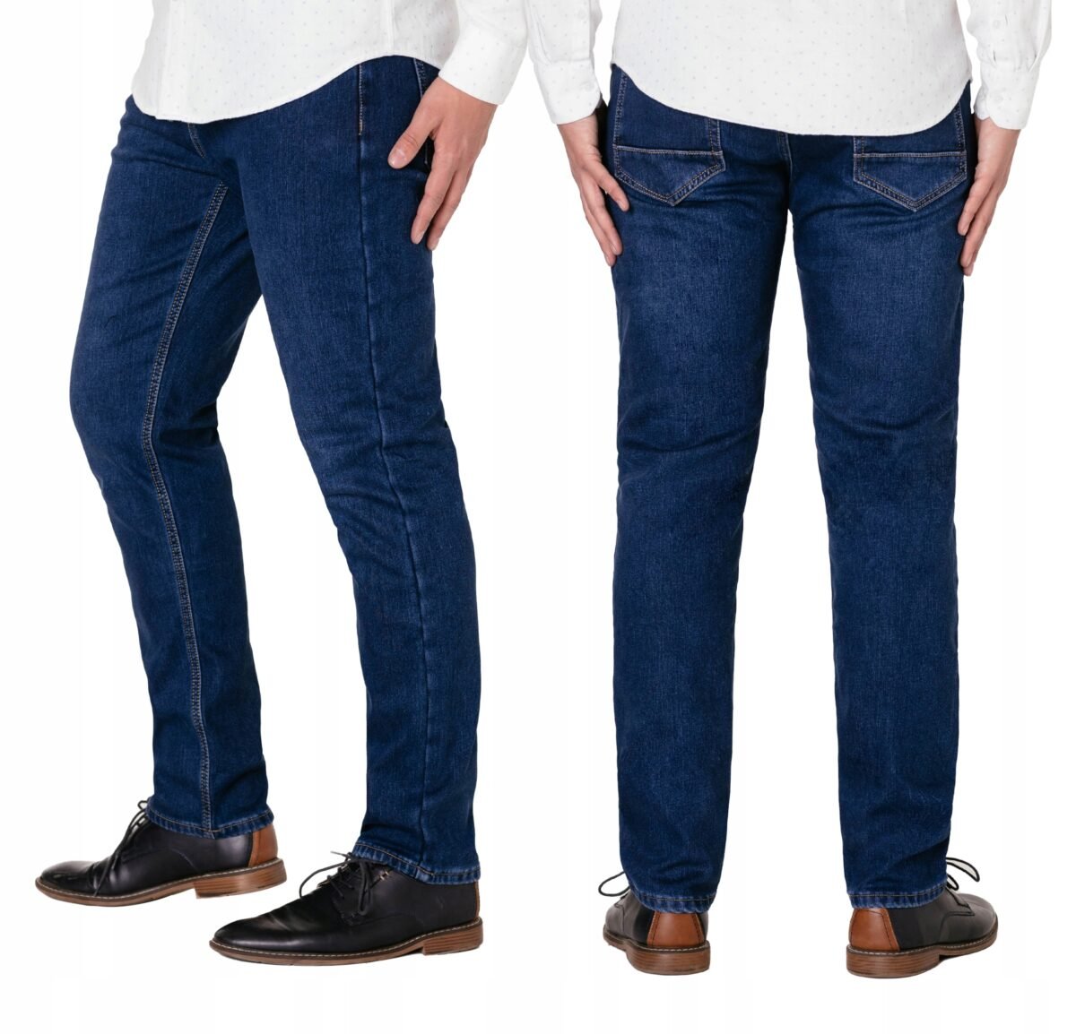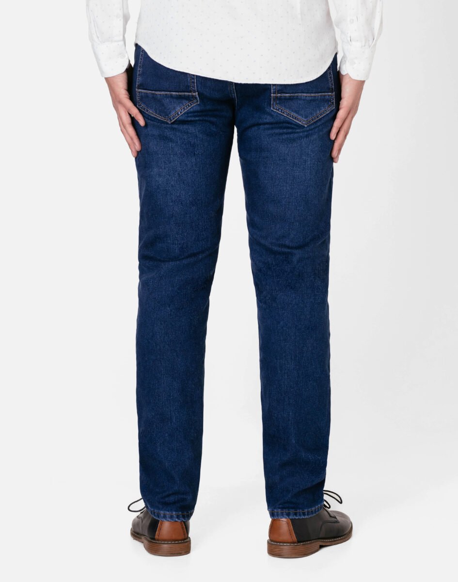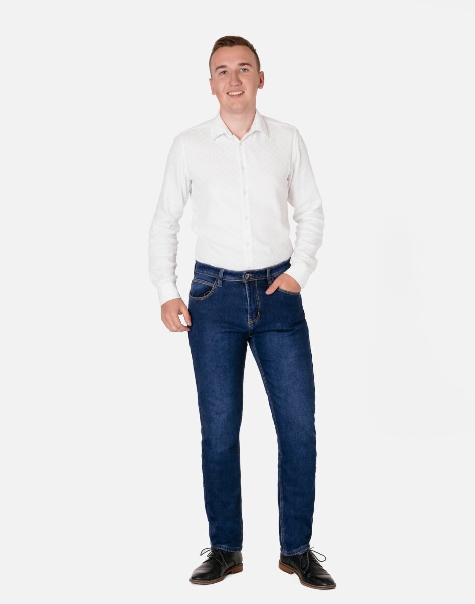 Ciepłe spodnie jeansowe męskie w kolorze granatowym "Dark Blue" na jesień zimę z podwyższonym stanem i klasycznymi prostymi nogawkami, ocieplone od wewnętrznej strony polarem. Zapinane na zamek błyskawiczny i metalowy guzik sygnowany logiem firmy. Z przodu mają dwie kieszonki zaokrąglone oraz mniejszą kieszonkę tzw. bilonówkę, a na tyle klasyczne kieszenie naszywane jak w typowych spodniach jeansowych. W pasie szlufki umożliwiające stylizacje z paskiem. Najbardziej podatne na uszkodzenia miejsca wzmocnione są dodatkowymi przeszyciami i metalowymi nitami. Wykonane z wysokiej jakości, trwałej i mocnej, delikatnie elastycznej tkaniny jeansowej o jednolitym granatowym wybarwieniu "Dark Blue". Niewielki dodatek spandexu (lycra) sprawia, że spodnie są bardziej elastyczne, dobrze dopasowują się do sylwetki, i są bardzo komfortowe w użytkowaniu. Łatwo się je zakłada i są znacznie wygodniejsze od jeansów, które lycry nie mają. Poza tym bawełna ma tendencję do kurczenia się w praniu, dlatego lycra sprawia, że spodnie są wyjątkowo praktyczne i można je bez problemu założyć po wysuszeniu. Pozwalają na pełną swobodę ruchów, co daje wygodę przy siadaniu i zapewnia ogromny komfort noszenia.