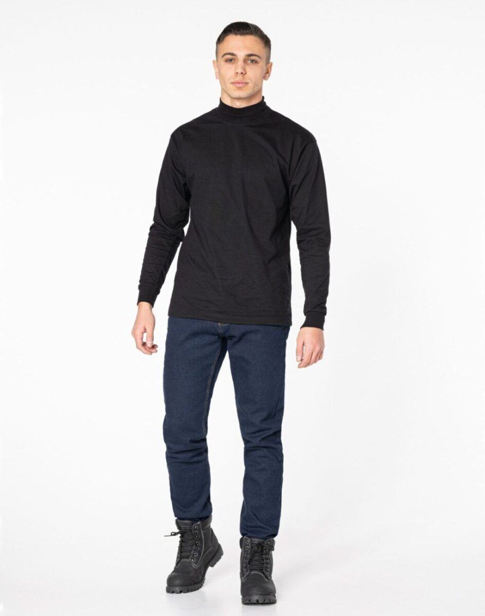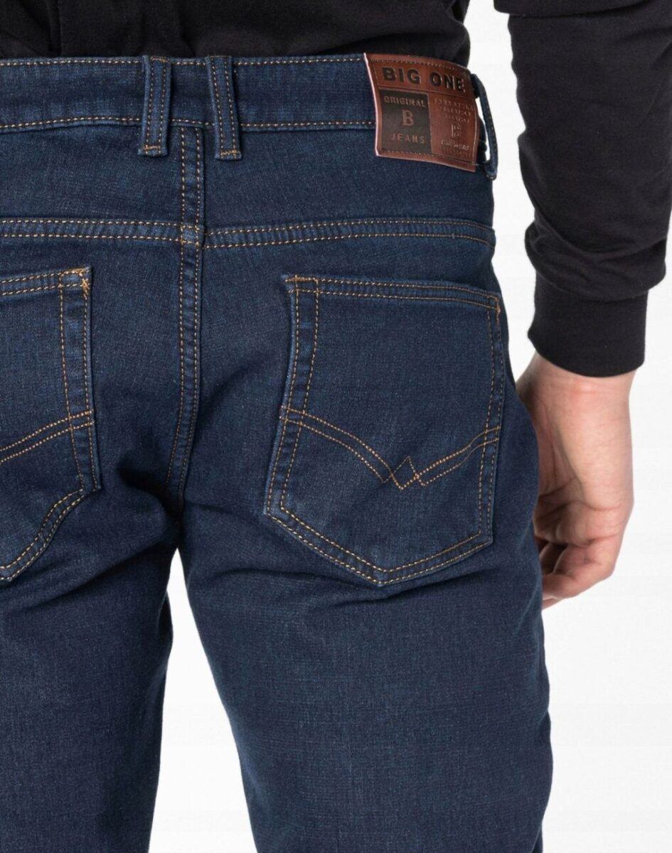 Ciepłe spodnie jeansowe męskie w kolorze granatowym na jesień zimę z podwyższonym stanem i ocieplone od wewnętrznej strony mikropolarem. Zapinane są na zamek błyskawiczny i metalowy guzik sygnowany logiem firmy. Z przodu mają dwie kieszonki zaokrąglone oraz bilonówkę a na tyle klasyczne kieszenie naszywane jak w typowych spodniach jeansowych. W pasie szlufki umożliwiające stylizacje z paskiem. Najbardziej podatne na uszkodzenia miejsca wzmocnione są dodatkowymi przeszyciami i metalowymi nitami. Uszyte z mocnej tkaniny jeansowej z niewielkim dodatkiem streczu (lycra), dzięki czemu spodnie są bardziej elastyczne co pozwala na pełną swobodę ruchów, daje komfort przy siadaniu i zapewnia ogromny komfort noszenia.