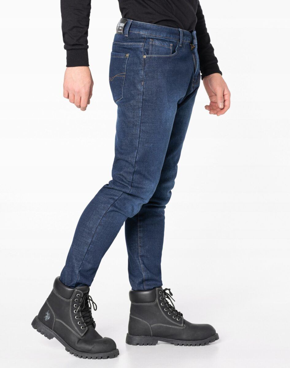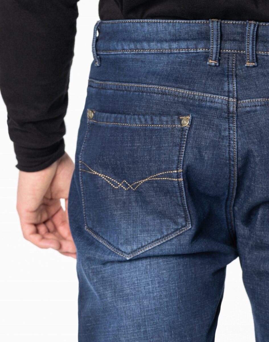 Ciepłe spodnie jeansowe męskie w kolorze granatowym na jesień zimę z podwyższonym stanem i ocieplone od wewnętrznej strony mikropolarem. Zapinane są na zamek błyskawiczny i metalowy guzik sygnowany logiem firmy. Z przodu mają dwie kieszonki zaokrąglone oraz bilonówkę a na tyle klasyczne kieszenie naszywane jak w typowych spodniach jeansowych. W pasie szlufki umożliwiające stylizacje z paskiem. Najbardziej podatne na uszkodzenia miejsca wzmocnione są dodatkowymi przeszyciami i metalowymi nitami. Uszyte z mocnej tkaniny jeansowej z niewielkim dodatkiem streczu (spandex), dzięki czemu spodnie są bardziej elastyczne co pozwala na pełną swobodę ruchów, daje komfort przy siadaniu i zapewnia ogromny komfort noszenia.