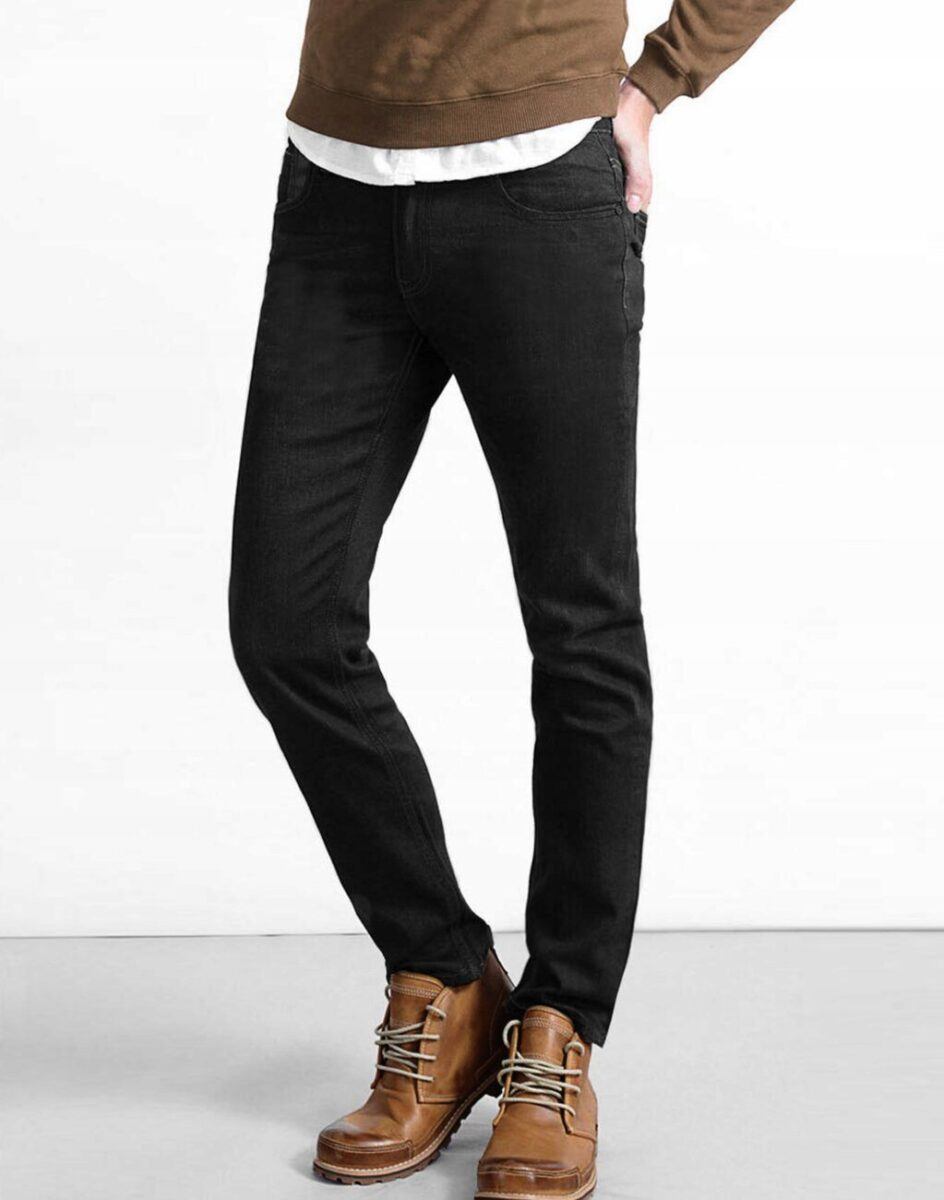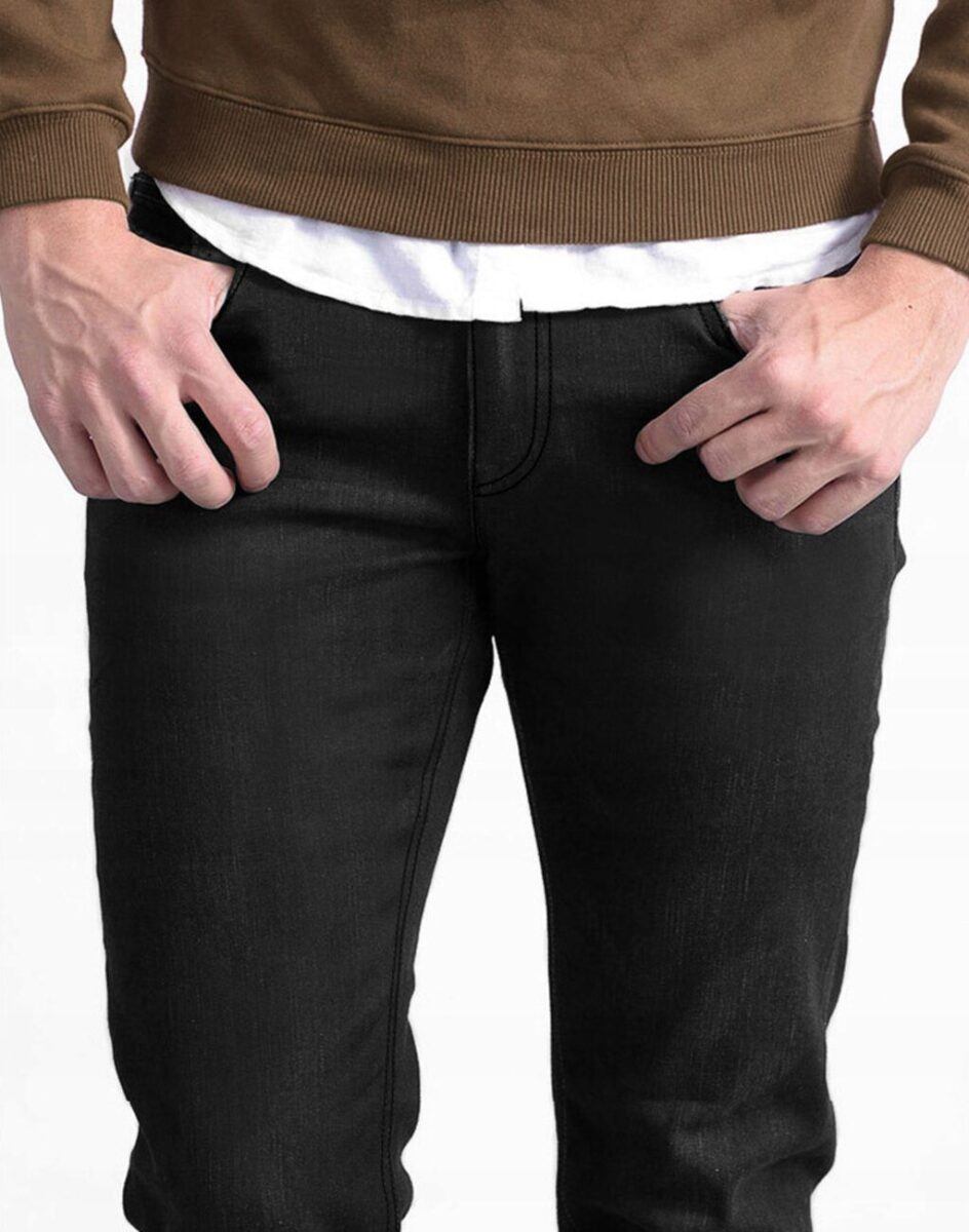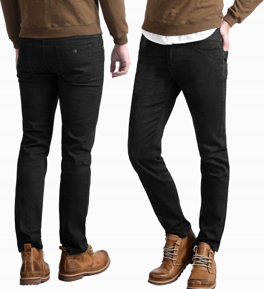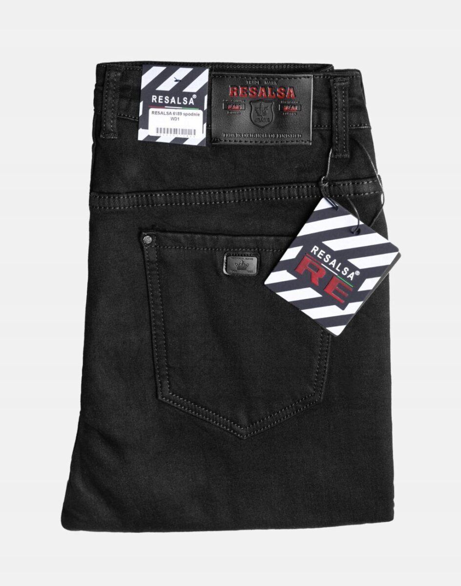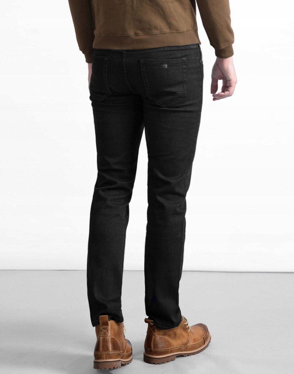 Ciepłe spodnie jeansowe męskie w kolorze czarnym na jesień zimę z podwyższonym stanem i ocieplone od wewnętrznej strony mikropolarem. Zapinane są na zamek błyskawiczny i metalowy guzik sygnowany logiem firmy. Z przodu mają dwie kieszonki zaokrąglone oraz bilonówkę, a na tyle klasyczne kieszenie naszywane jak w typowych spodniach jeansowych. W pasie szlufki umożliwiające stylizacje z paskiem. Najbardziej podatne na uszkodzenia miejsca wzmocnione są dodatkowymi przeszyciami i metalowymi nitami. Uszyte z mocnej tkaniny jeansowej z niewielkim dodatkiem streczu (elastan), dzięki czemu spodnie są bardziej elastyczne co pozwala na pełną swobodę ruchów, daje komfort przy siadaniu i zapewnia ogromny komfort noszenia.
