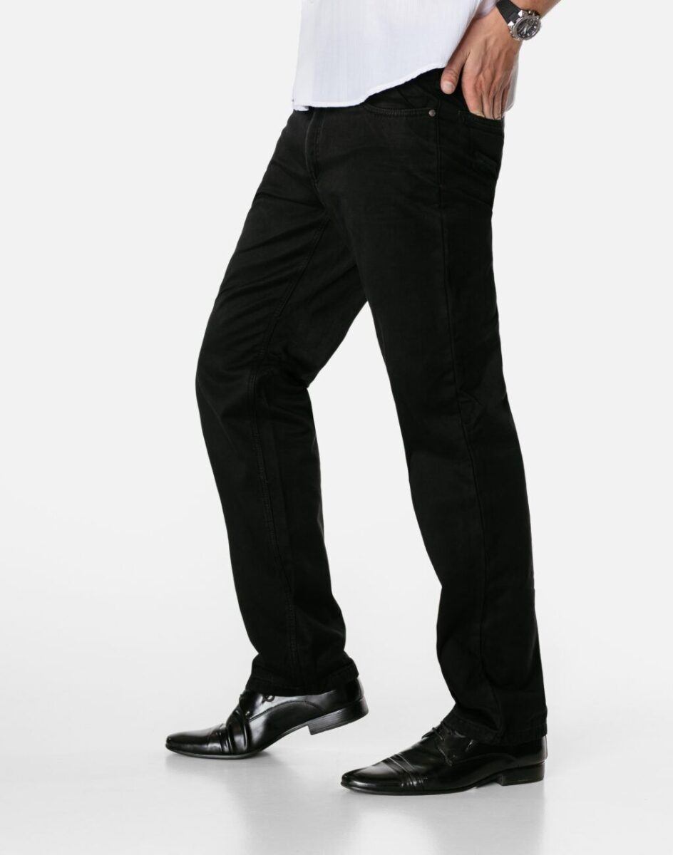 Wyjątkowo ciepłe bo ocieplone od wewnętrznej strony polarem spodnie męskie bawełniane w kolorze czarnym na jesień, zimę, z podwyższonym stanem i klasyczną prostą nogawką Regular Fit. Zapinane na kryty zamek błyskawiczny i metalowy guzik sygnowany logiem firmy. Z przodu mają dwie kieszonki zaokrąglone oraz bilonówkę, a na tyle klasyczne kieszenie naszywane jak w typowych spodniach jeansowych. W pasie szlufki umożliwiające stylizacje z paskiem. Najbardziej podatne na uszkodzenia miejsca wzmocnione są dodatkowymi przeszyciami i metalowymi nitami. Uszyte z solidnej i mocnej tkaniny 100% bawełnianej wygodnej w użytkowaniu.