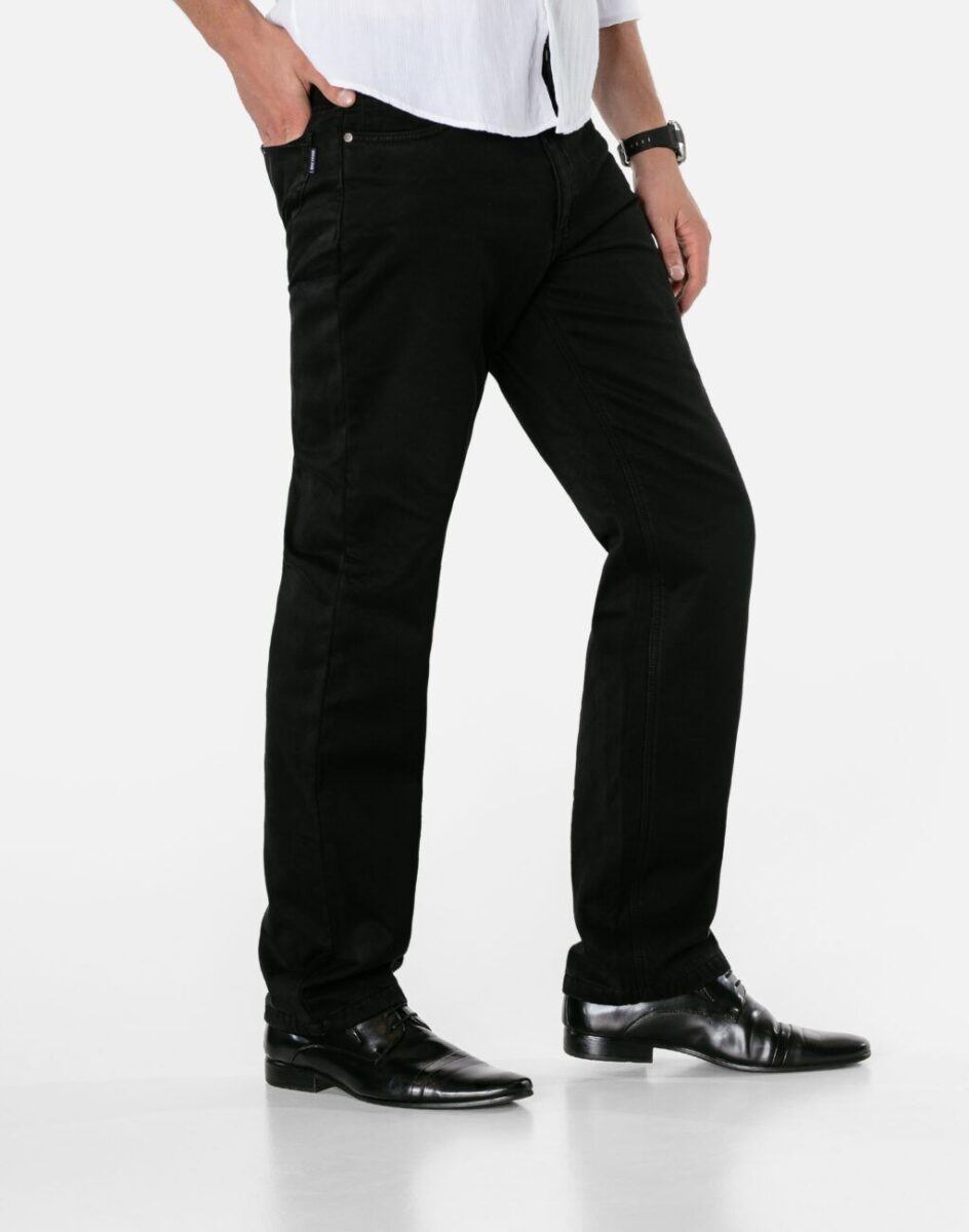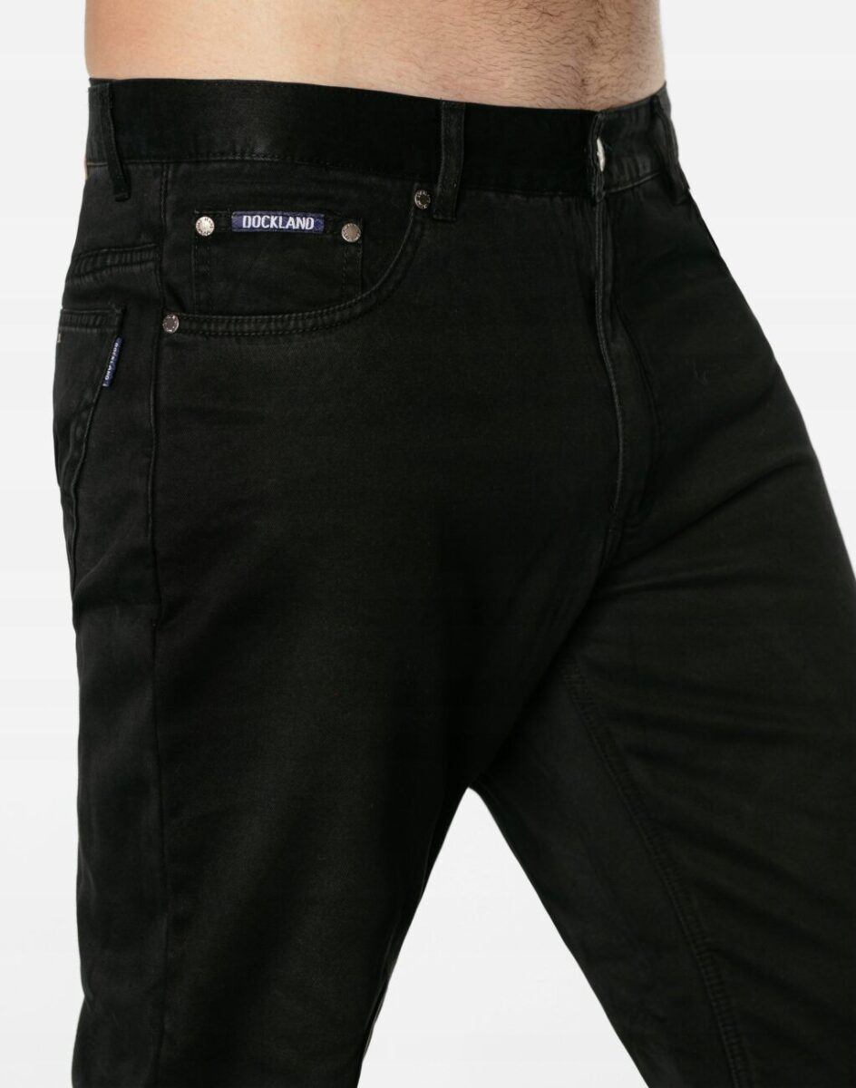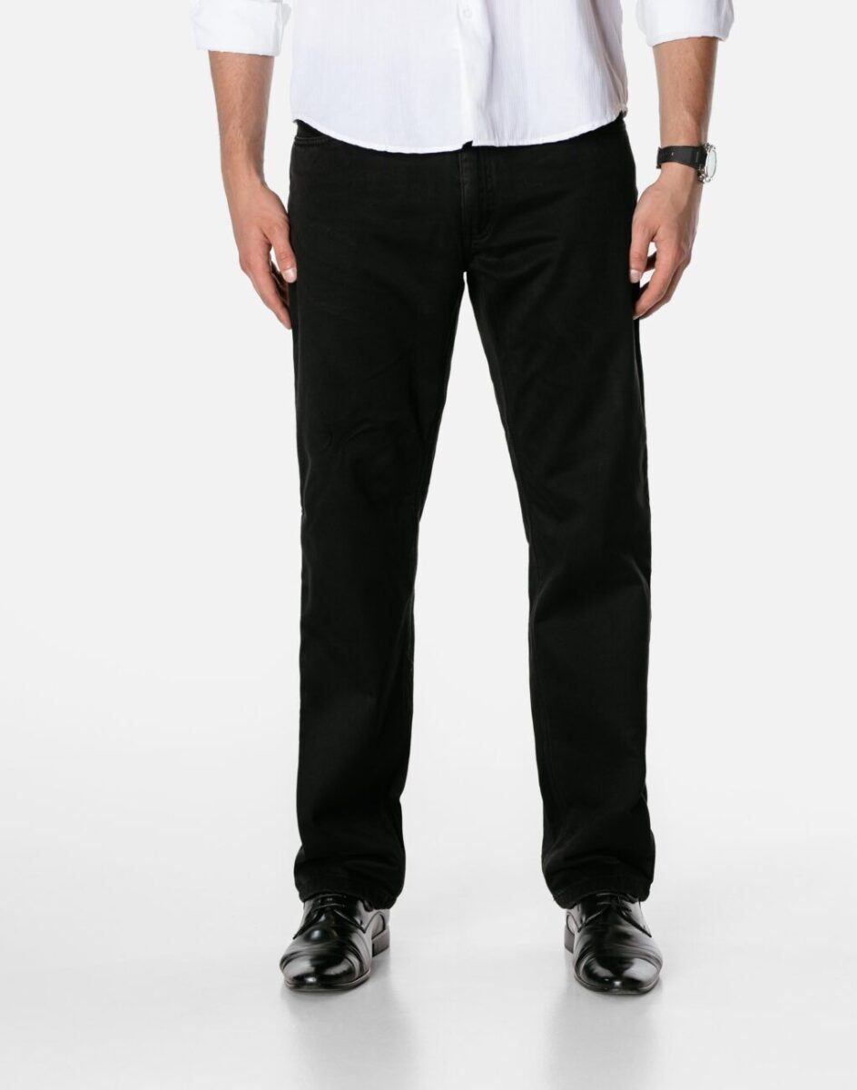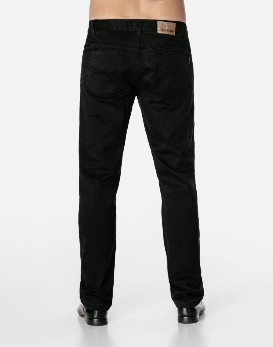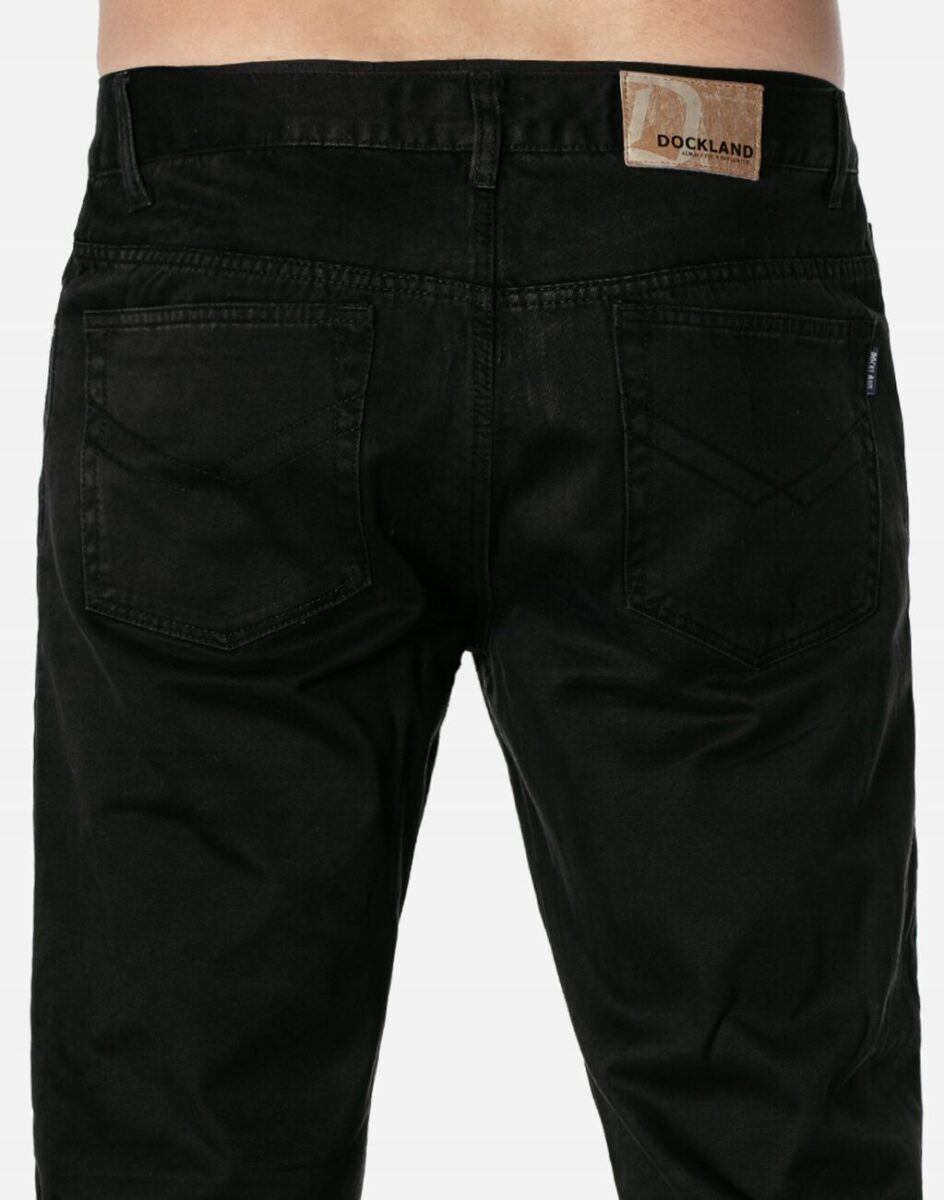 Wyjątkowo ciepłe bo ocieplone od wewnętrznej strony polarem spodnie męskie bawełniane w kolorze czarnym na jesień, zimę, z podwyższonym stanem i klasyczną prostą nogawką Regular Fit. Zapinane na kryty zamek błyskawiczny i metalowy guzik sygnowany logiem firmy. Z przodu mają dwie kieszonki zaokrąglone oraz bilonówkę, a na tyle klasyczne kieszenie naszywane jak w typowych spodniach jeansowych. W pasie szlufki umożliwiające stylizacje z paskiem. Najbardziej podatne na uszkodzenia miejsca wzmocnione są dodatkowymi przeszyciami i metalowymi nitami. Uszyte z solidnej i mocnej tkaniny 100% bawełnianej wygodnej w użytkowaniu.