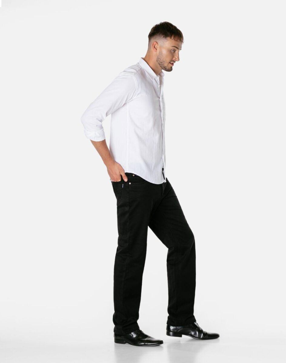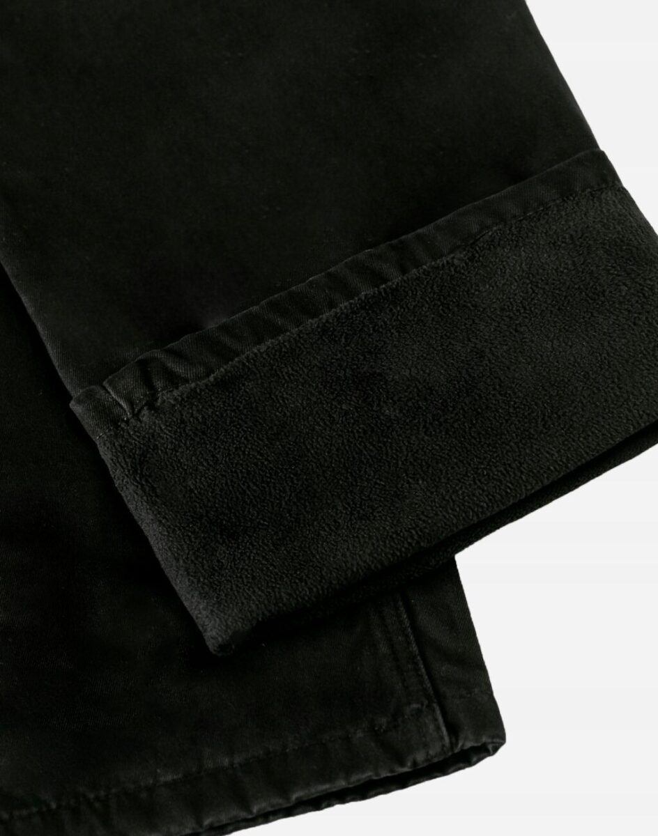 Wyjątkowo ciepłe bo ocieplone od wewnętrznej strony polarem spodnie męskie bawełniane w kolorze czarnym na jesień, zimę, z podwyższonym stanem i klasyczną prostą nogawką Regular Fit. Zapinane na kryty zamek błyskawiczny i metalowy guzik sygnowany logiem firmy. Z przodu mają dwie kieszonki zaokrąglone oraz bilonówkę, a na tyle klasyczne kieszenie naszywane jak w typowych spodniach jeansowych. W pasie szlufki umożliwiające stylizacje z paskiem. Najbardziej podatne na uszkodzenia miejsca wzmocnione są dodatkowymi przeszyciami i metalowymi nitami. Uszyte z solidnej i mocnej tkaniny 100% bawełnianej wygodnej w użytkowaniu.