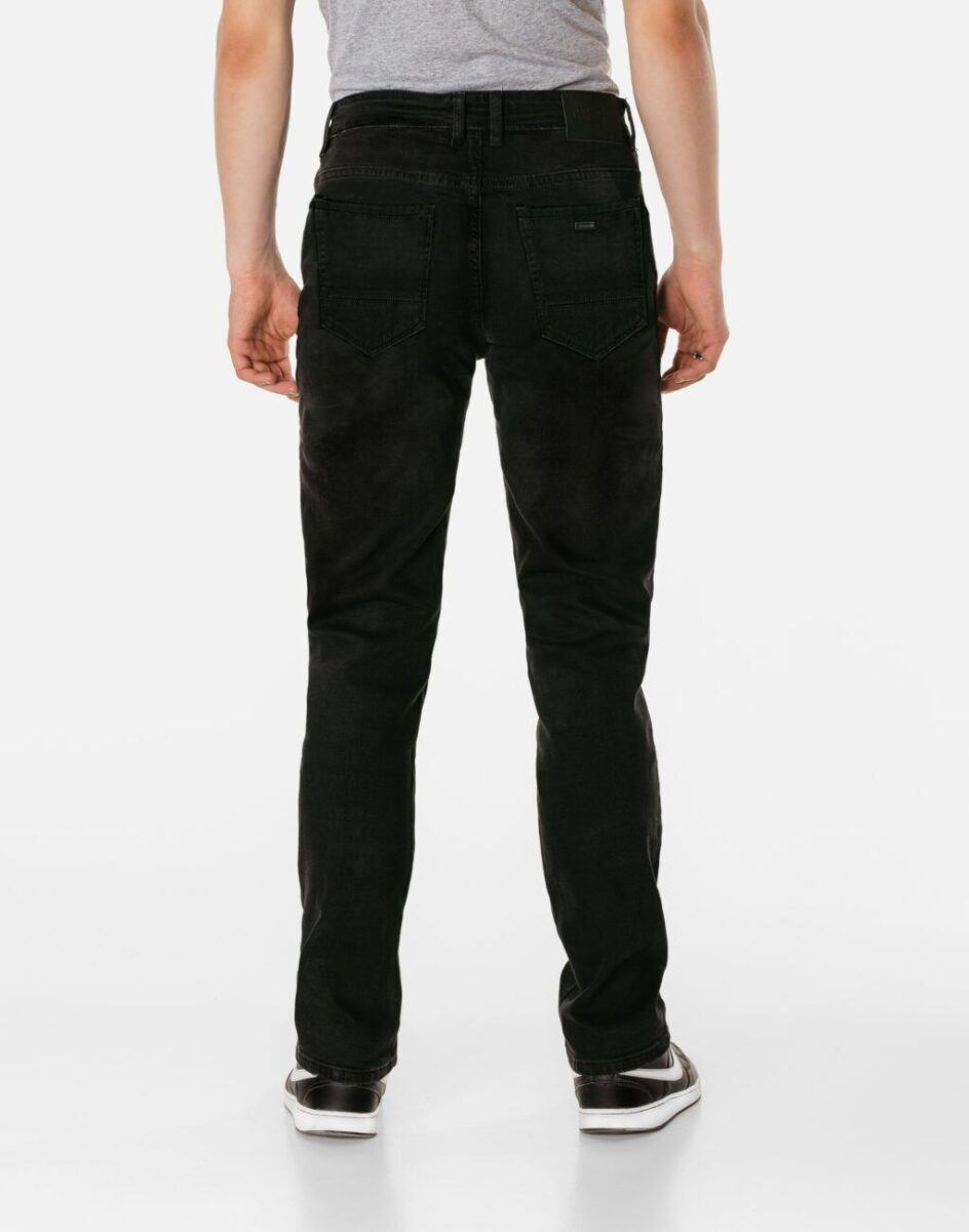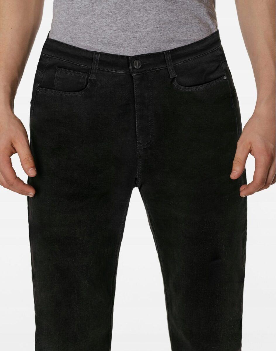 Ciepłe spodnie jeansowe męskie w kolorze czarnym „Super Black” na jesień zimę z podwyższonym stanem i ocieplone od wewnętrznej strony polarem. Zapinane na zamek błyskawiczny i metalowy guzik sygnowany logiem firmy. Z przodu mają dwie kieszonki zaokrąglone oraz bilonówkę, a na tyle klasyczne kieszenie naszywane jak w typowych spodniach jeansowych. W pasie szlufki umożliwiające stylizacje z paskiem. Najbardziej podatne na uszkodzenia miejsca wzmocnione są dodatkowymi przeszyciami i metalowymi nitami. Uszyte z mocnej tkaniny jeansowej z niewielkim dodatkiem streczu (poliester), dzięki czemu spodnie są bardziej elastyczne co pozwala na pełną swobodę ruchów, daje komfort przy siadaniu i zapewnia ogromny komfort noszenia.