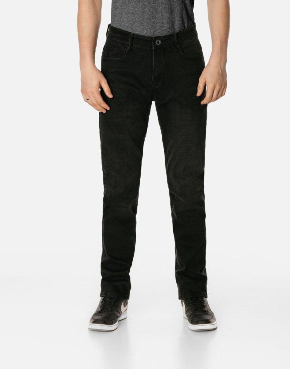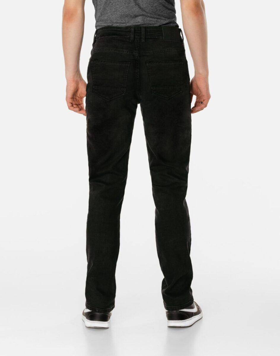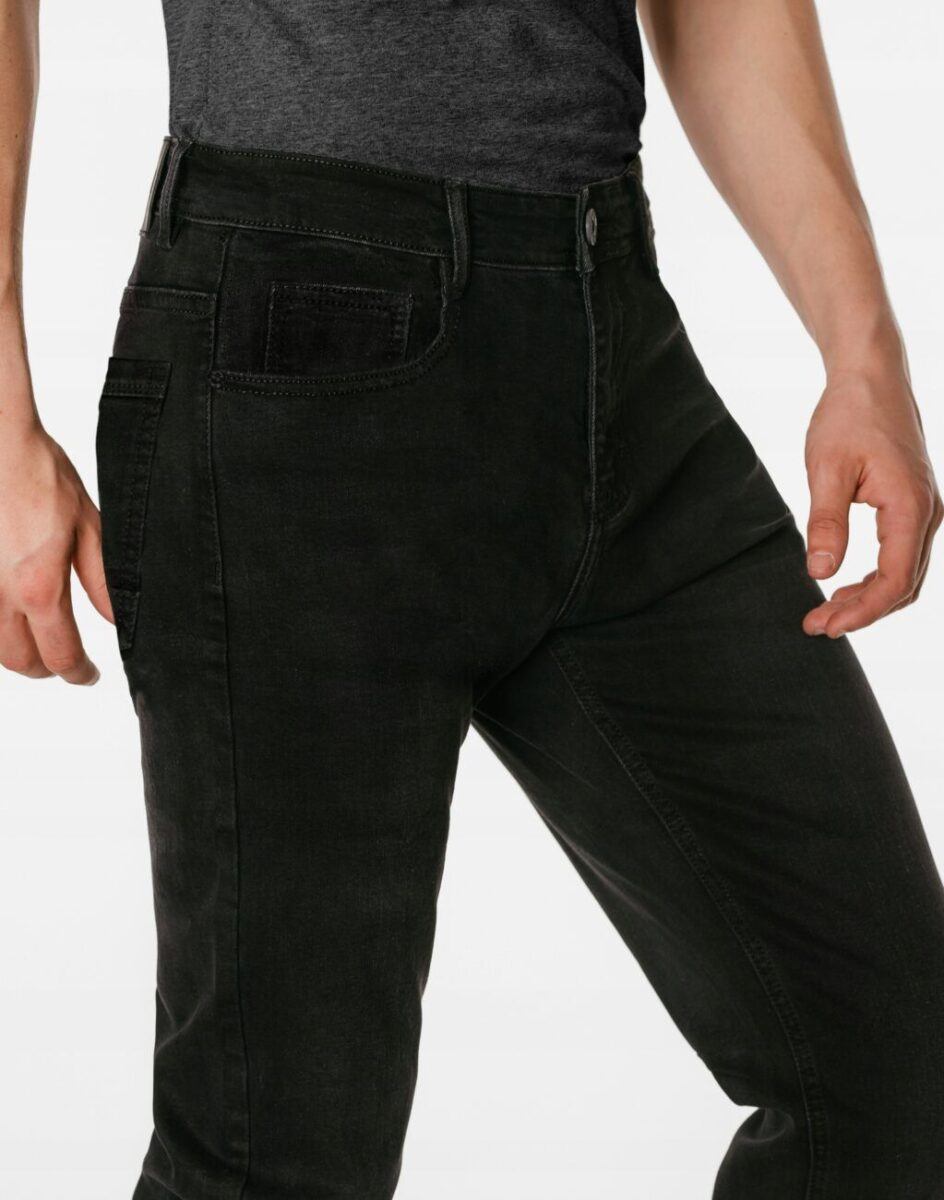 Ciepłe spodnie jeansowe męskie w kolorze czarnym „Dark Black” na jesień zimę z podwyższonym stanem i ocieplone od wewnętrznej strony polarem. Zapinane są na zamek błyskawiczny i metalowy guzik sygnowany logiem firmy. Z przodu mają dwie kieszonki zaokrąglone oraz bilonówkę, a na tyle klasyczne kieszenie naszywane jak w typowych spodniach jeansowych. W pasie szlufki umożliwiające stylizacje z paskiem. Najbardziej podatne na uszkodzenia miejsca wzmocnione są dodatkowymi przeszyciami i metalowymi nitami. Uszyte z mocnej tkaniny jeansowej z niewielkim dodatkiem poliestru dzięki czemu spodnie są bardziej elastyczne co pozwala na pełną swobodę ruchów, daje komfort przy siadaniu i zapewnia ogromny komfort noszenia.