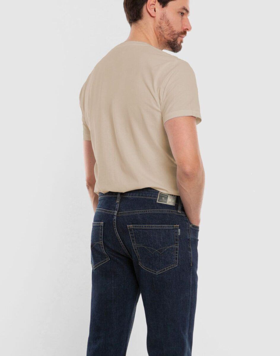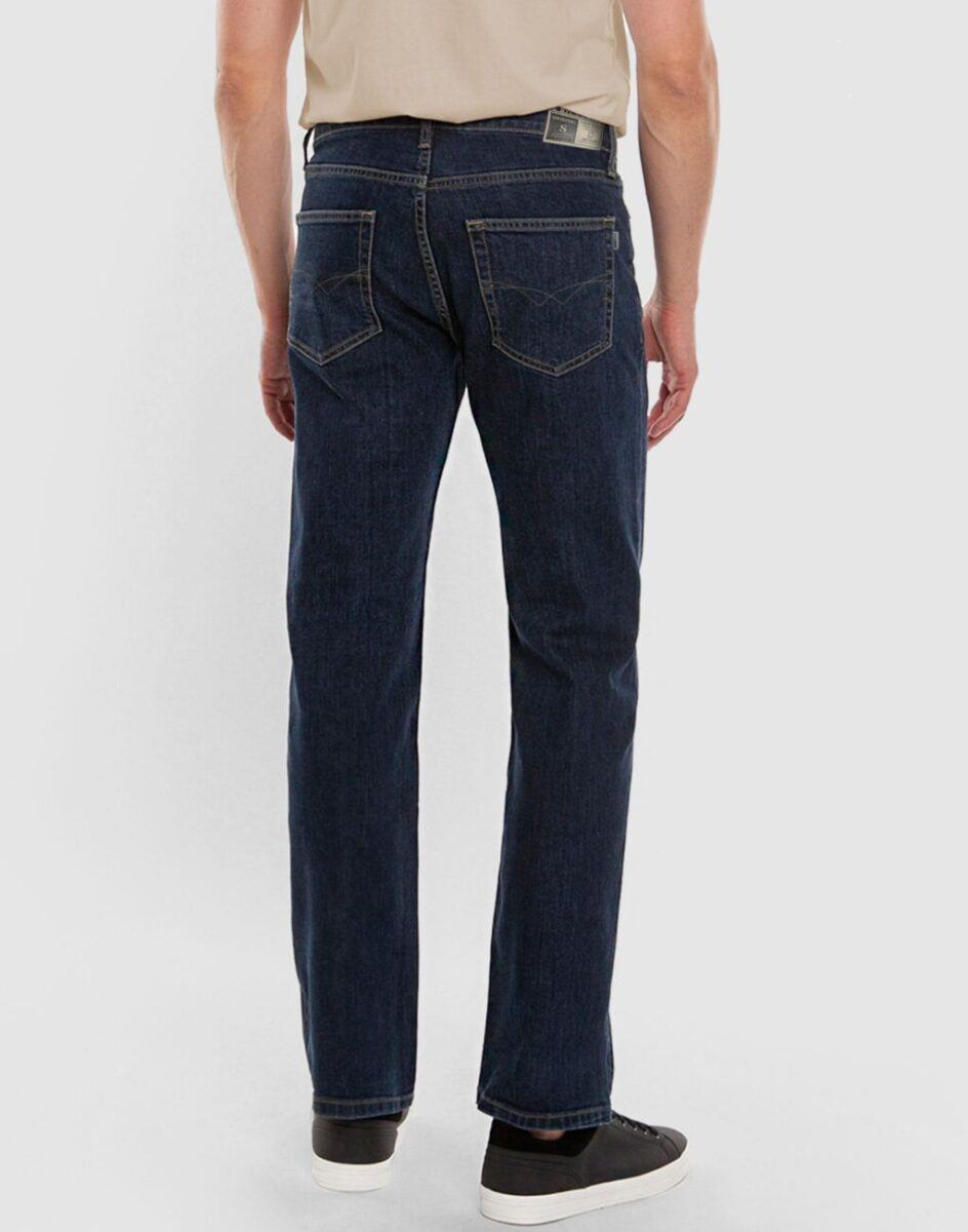 Ciepłe spodnie jeansowe męskie w kolorze granatowym „Dark Blue” na jesień zimę z podwyższonym stanem i ocieplone od wewnętrznej strony polarem. Zapinane są na zamek błyskawiczny i metalowy guzik sygnowany logiem firmy. Z przodu mają dwie kieszonki zaokrąglone oraz bilonówkę, a na tyle klasyczne kieszenie naszywane jak w typowych spodniach jeansowych. W pasie szlufki umożliwiające stylizacje z paskiem. Najbardziej podatne na uszkodzenia miejsca wzmocnione są dodatkowymi przeszyciami i metalowymi nitami. Uszyte z mocnej tkaniny jeansowej z dodatkiem poliestru i elastanu, dzięki czemu spodnie są bardziej elastyczne co pozwala na pełną swobodę ruchów, daje komfort przy siadaniu i zapewnia ogromny komfort noszenia.
