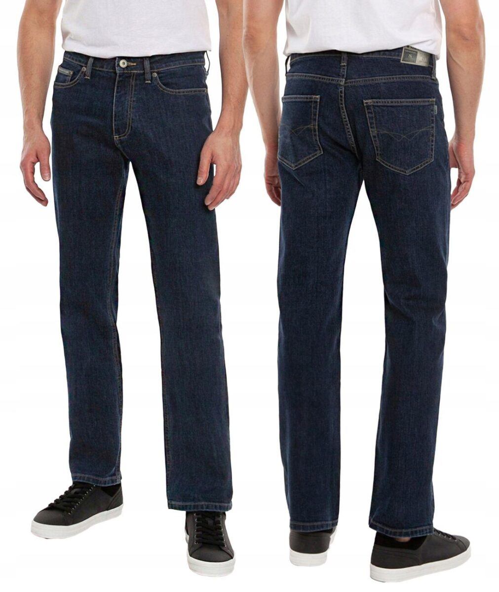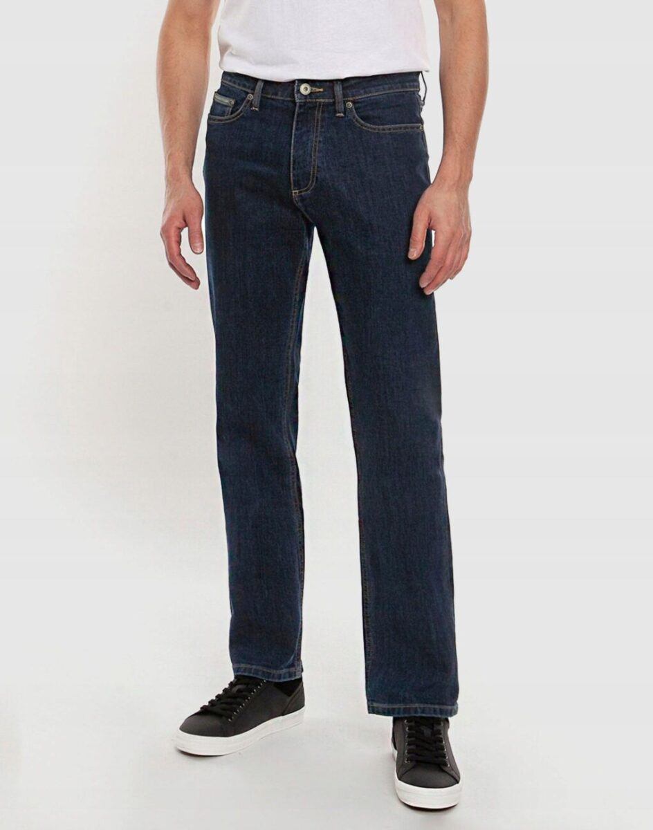 Ciepłe spodnie jeansowe męskie w kolorze granatowym „Dark Blue” na jesień zimę z podwyższonym stanem i ocieplone od wewnętrznej strony polarem. Zapinane są na zamek błyskawiczny i metalowy guzik sygnowany logiem firmy. Z przodu mają dwie kieszonki zaokrąglone oraz bilonówkę, a na tyle klasyczne kieszenie naszywane jak w typowych spodniach jeansowych. W pasie szlufki umożliwiające stylizacje z paskiem. Najbardziej podatne na uszkodzenia miejsca wzmocnione są dodatkowymi przeszyciami i metalowymi nitami. Uszyte z mocnej tkaniny jeansowej z dodatkiem poliestru i streczu dzięki czemu spodnie są bardziej elastyczne co pozwala na pełną swobodę ruchów, daje komfort przy siadaniu i zapewnia ogromny komfort noszenia.