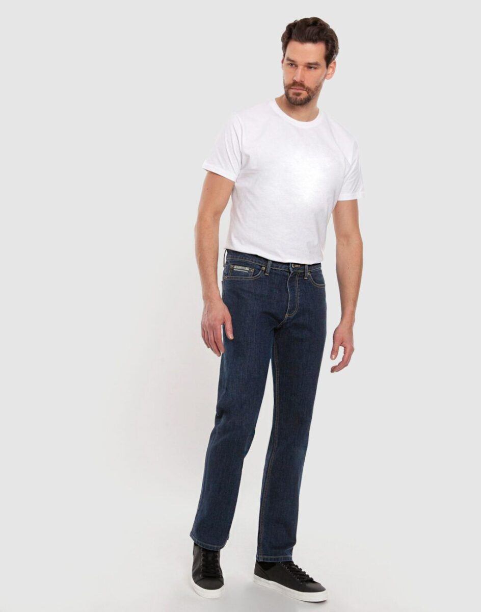 Ciepłe spodnie jeansowe męskie w kolorze granatowym „Dark Blue” na jesień zimę z podwyższonym stanem i ocieplone od wewnętrznej strony polarem. Zapinane są na zamek błyskawiczny i metalowy guzik sygnowany logiem firmy. Z przodu mają dwie kieszonki zaokrąglone oraz bilonówkę, a na tyle klasyczne kieszenie naszywane jak w typowych spodniach jeansowych. W pasie szlufki umożliwiające stylizacje z paskiem. Najbardziej podatne na uszkodzenia miejsca wzmocnione są dodatkowymi przeszyciami i metalowymi nitami. Uszyte z mocnej tkaniny jeansowej z dodatkiem poliestru i streczu dzięki czemu spodnie są bardziej elastyczne co pozwala na pełną swobodę ruchów, daje komfort przy siadaniu i zapewnia ogromny komfort noszenia.