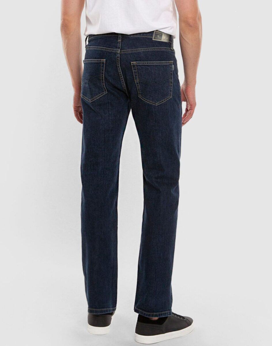 Ciepłe spodnie jeansowe męskie w kolorze granatowym „Dark Blue” na jesień zimę z podwyższonym stanem i ocieplone od wewnętrznej strony polarem. Zapinane są na zamek błyskawiczny i metalowy guzik sygnowany logiem firmy. Z przodu mają dwie kieszonki zaokrąglone oraz bilonówkę, a na tyle klasyczne kieszenie naszywane jak w typowych spodniach jeansowych. W pasie szlufki umożliwiające stylizacje z paskiem. Najbardziej podatne na uszkodzenia miejsca wzmocnione są dodatkowymi przeszyciami i metalowymi nitami. Uszyte z mocnej tkaniny jeansowej z dodatkiem poliestru i streczu dzięki czemu spodnie są bardziej elastyczne co pozwala na pełną swobodę ruchów, daje komfort przy siadaniu i zapewnia ogromny komfort noszenia.