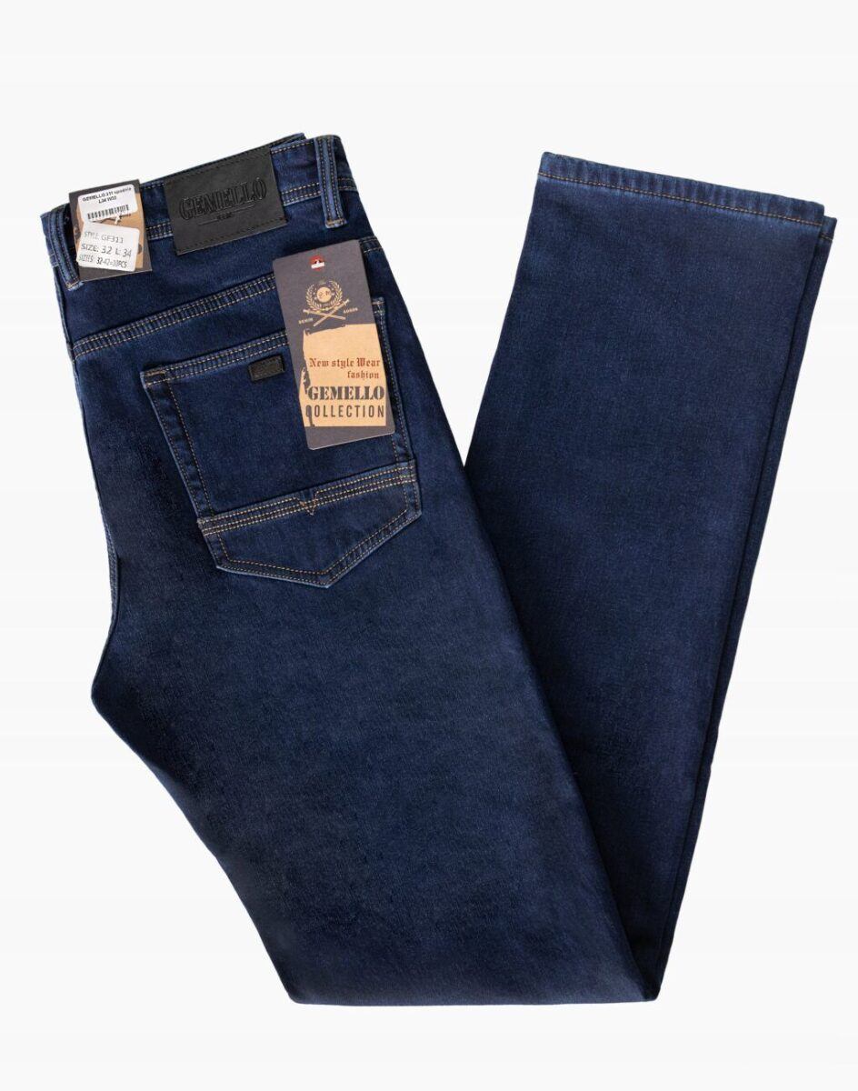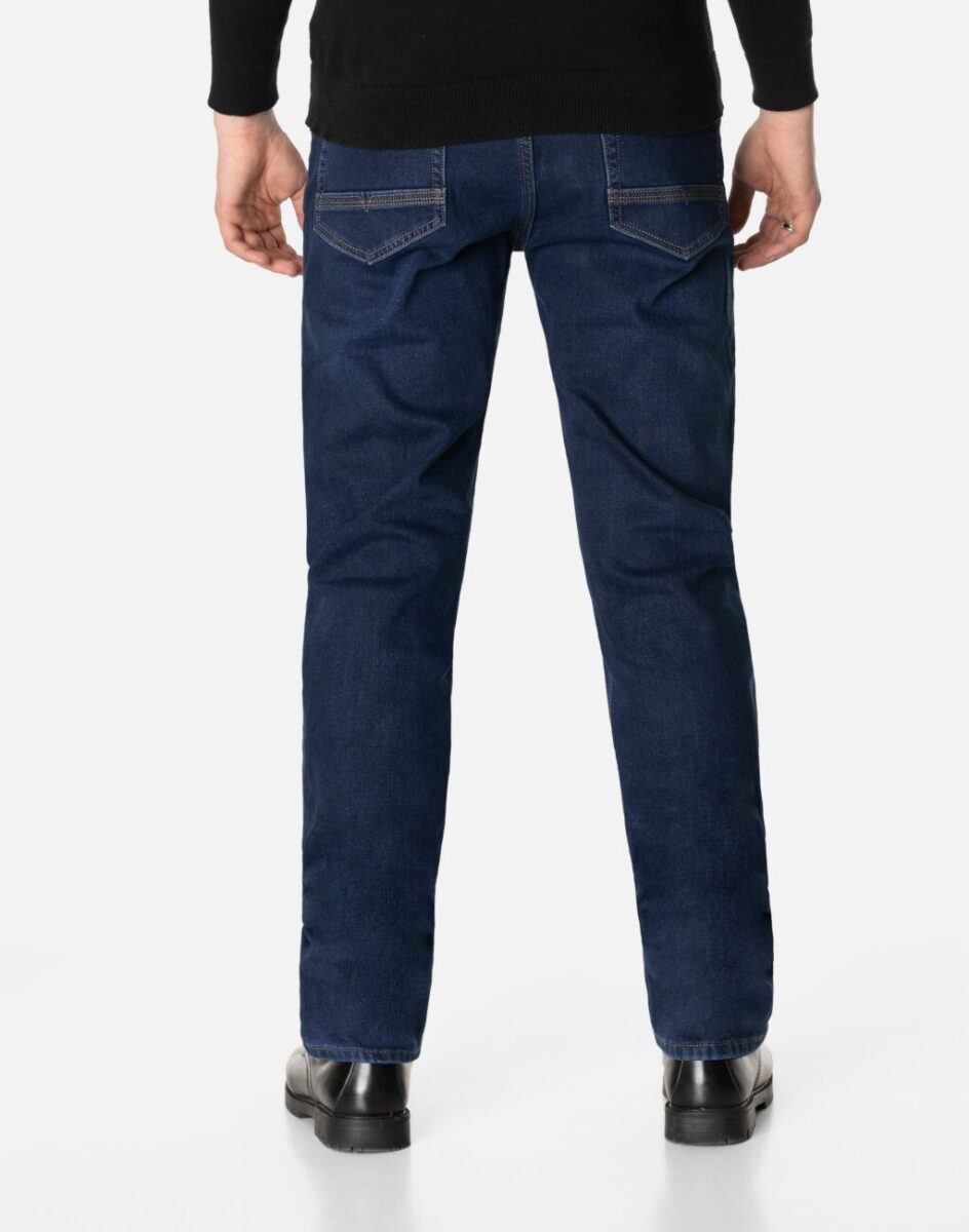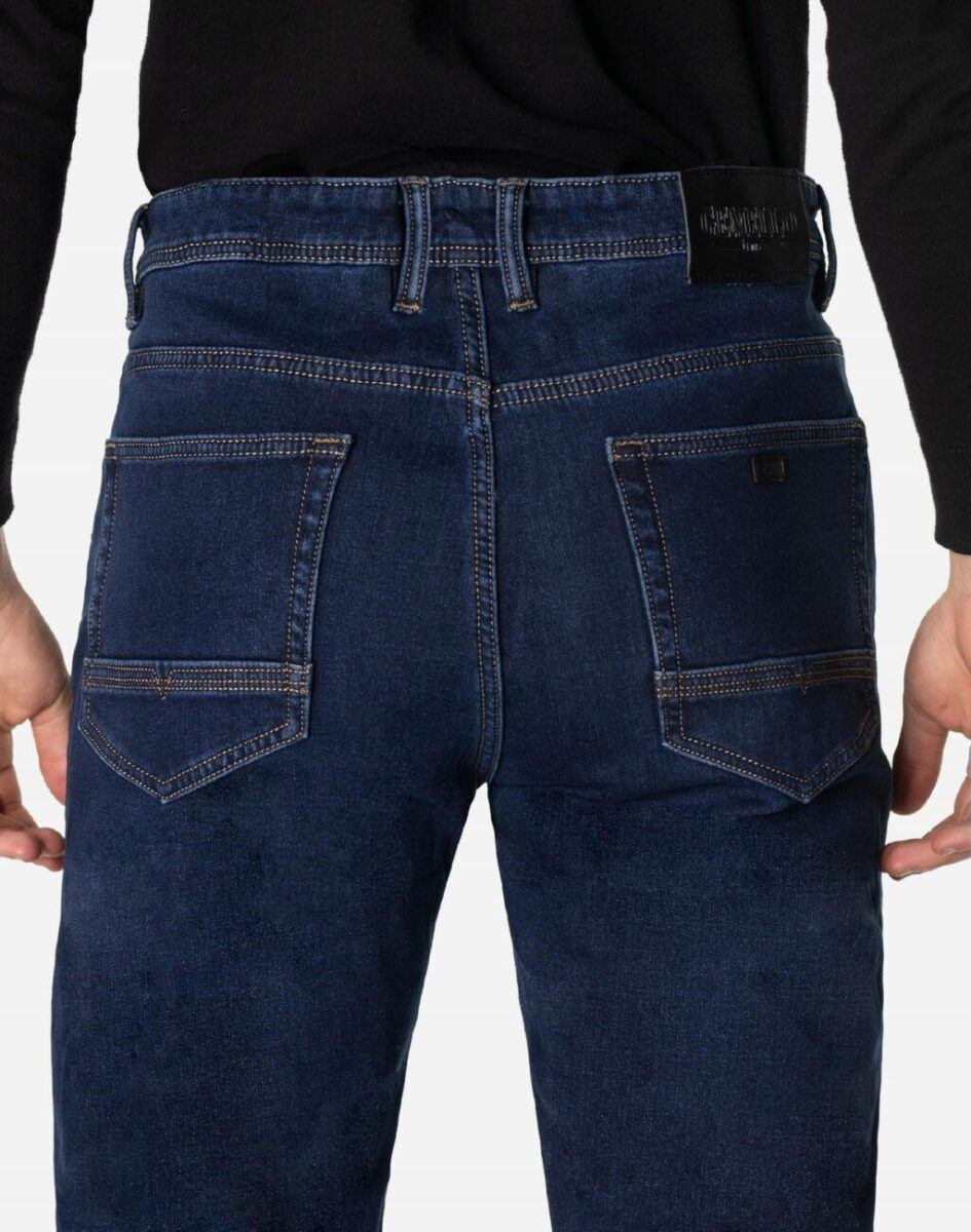 Ciepłe spodnie jeansowe męskie w kolorze granatowym „Dark Blue” na jesień zimę z podwyższonym stanem i ocieplone od wewnętrznej strony polarem. Zapinane są na zamek błyskawiczny i metalowy guzik sygnowany logiem firmy. Z przodu mają dwie kieszonki zaokrąglone oraz bilonówkę, a na tyle klasyczne kieszenie naszywane jak w typowych spodniach jeansowych. W pasie szlufki umożliwiające stylizacje z paskiem. Najbardziej podatne na uszkodzenia miejsca wzmocnione są dodatkowymi przeszyciami i metalowymi nitami. Uszyte z mocnej tkaniny jeansowej z dodatkiem poliestru dzięki czemu spodnie są bardziej elastyczne co pozwala na pełną swobodę ruchów, daje komfort przy siadaniu i zapewnia ogromny komfort noszenia.