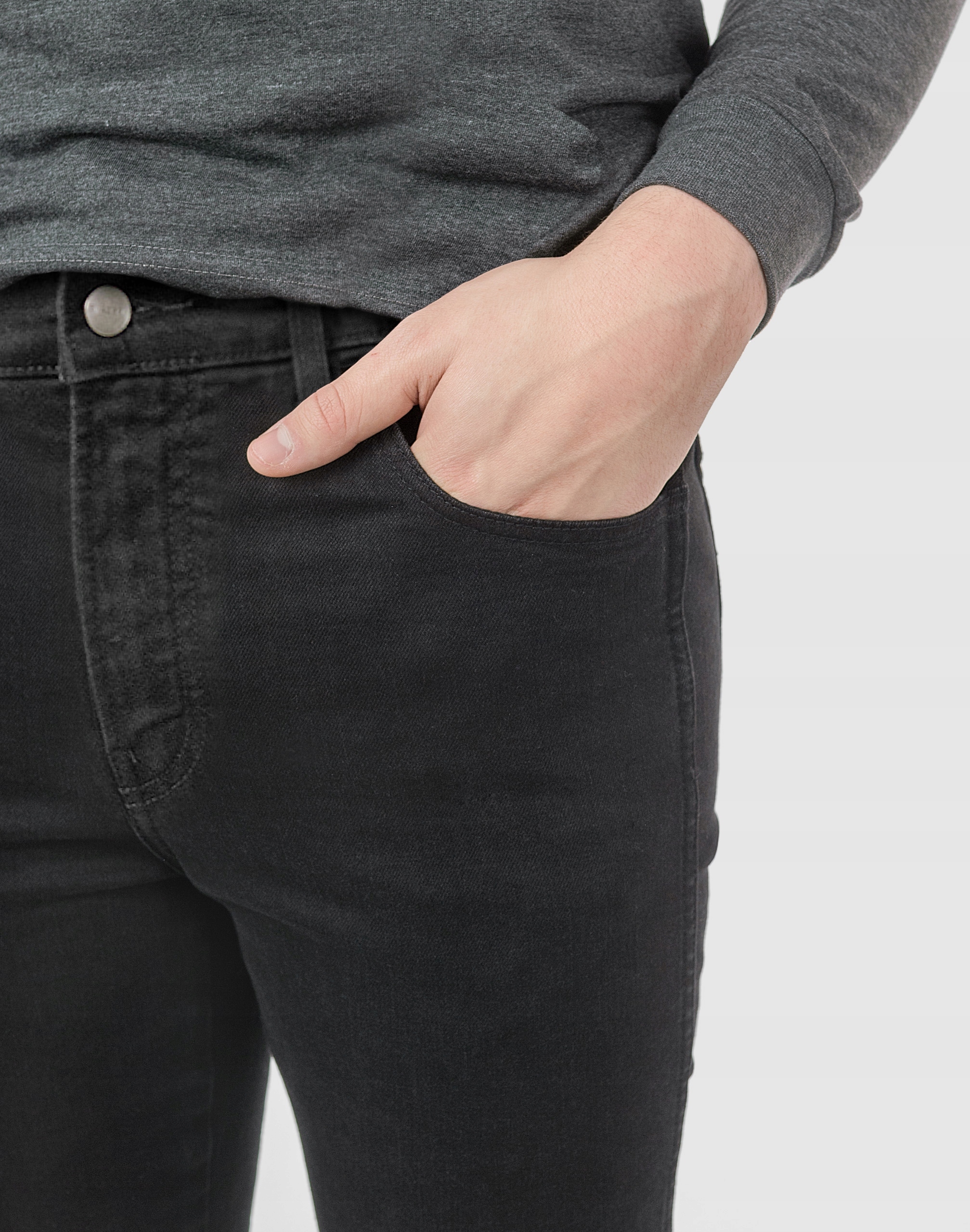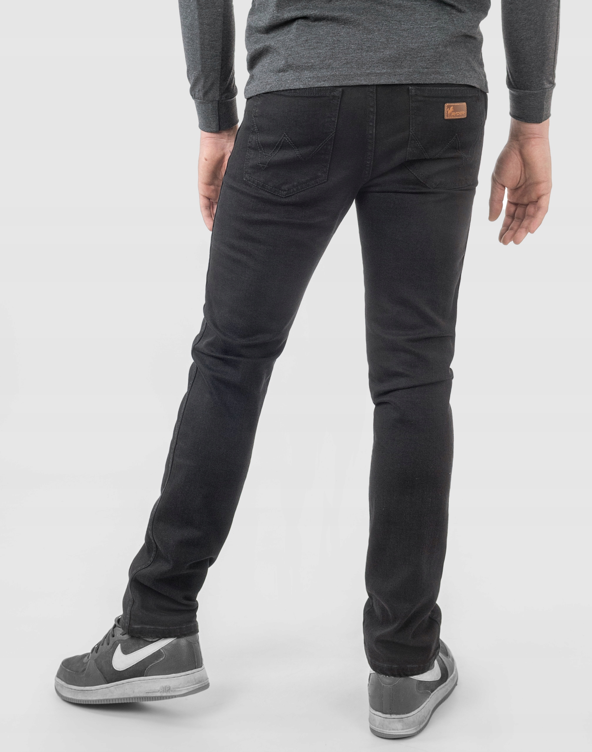 Czarne jeansy męskie polskiej firmy RADER ze standardowym stanem i klasyczną prostą nogawką to również jeden z najczęściej wybieranych modeli spodni. Wykonane z wysokiej jakości gęstej, trwałej i mocnej tkaniny bawełnianej "Denim Super Black". Zapinane są na kryty zamek błyskawiczny i metalowy guzik sygnowany logiem firmy. Z przodu mają dwie kieszonki zaokrąglone oraz mniejszą kieszonkę tzw. bilonówkę, a na tyle klasyczne kieszenie naszywane jak w typowych spodniach jeansowych. W pasie szlufki umożliwiające stylizację z paskiem. Najbardziej podatne na uszkodzenia miejsca wzmocnione są dodatkowymi przeszyciami oraz metalowymi nitami.