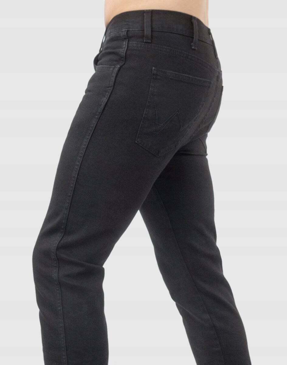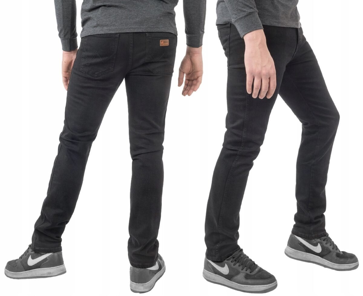 Czarne jeansy męskie polskiej firmy RADER ze standardowym stanem i klasyczną prostą nogawką to również jeden z najczęściej wybieranych modeli spodni. Wykonane z wysokiej jakości gęstej, trwałej i mocnej tkaniny bawełnianej "Denim Super Black". Zapinane są na kryty zamek błyskawiczny i metalowy guzik sygnowany logiem firmy. Z przodu mają dwie kieszonki zaokrąglone oraz mniejszą kieszonkę tzw. bilonówkę, a na tyle klasyczne kieszenie naszywane jak w typowych spodniach jeansowych. W pasie szlufki umożliwiające stylizację z paskiem. Najbardziej podatne na uszkodzenia miejsca wzmocnione są dodatkowymi przeszyciami oraz metalowymi nitami.