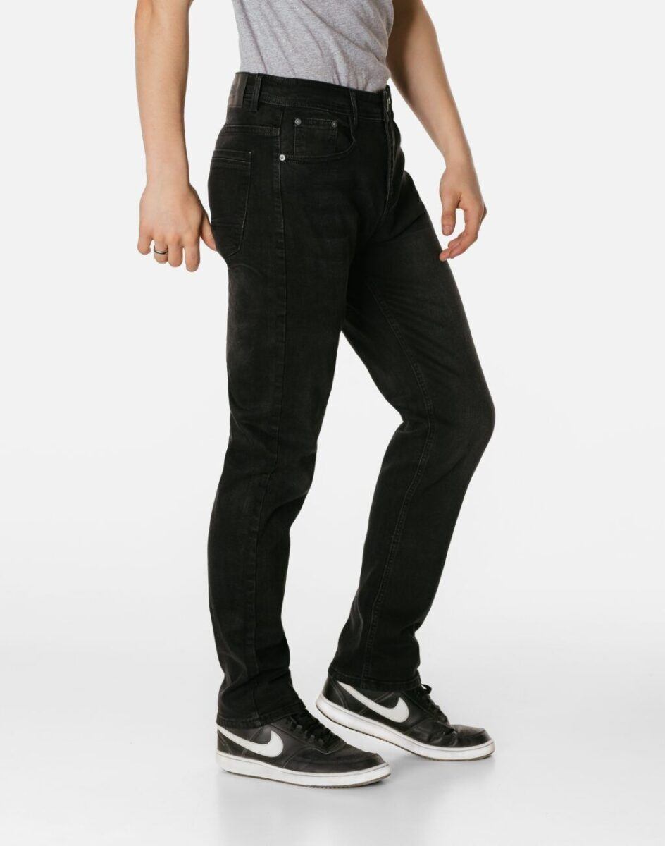 Uszyte z wysokiej jakości czarnej tkaniny jeansowej „Super Black” z domieszką lycry, dzięki czemu spodnie są bardziej elastyczne, dobrze dopasowują się do sylwetki i są bardzo komfortowe w użytkowaniu. Łatwo się je zakłada i są znacznie wygodniejsze od jeansów, które lycry nie mają. Poza tym bawełna ma tendencję do kurczenia się w praniu, dlatego lycra sprawia, że spodnie są wyjątkowo praktyczne i można je bez problemu założyć po wysuszeniu. Pozwalają na pełną swobodę ruchów, co daje wygodę przy siadaniu i zapewnia ogromny komfort noszenia.