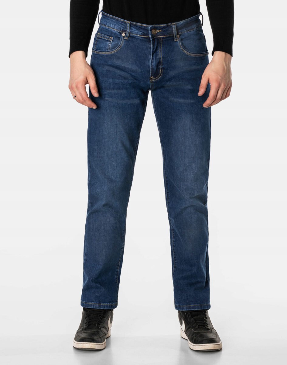Klasyczne i ponadczasowe spodnie męskie jeansowe model 2328#, umiarkowanie swobodne w biodrach, o prostych, smukłych nogawkach to jeden z najczęściej wybieranych przez mężczyzn modeli spodni. Wykonane z wysokiej jakości sprężystej, trwałej i mocnej tkaniny jeansowej w kolorze granatowym "Dark Blue" z delikatnymi przetarciami, dzięki niewielkiemu dodatkowi elastanu (lycra) wyjątkowo wygodnej w użytkowaniu. Niewielki dodatek elastanu (lycra) sprawia, że spodnie są bardziej elastyczne, dobrze dopasowują się do sylwetki, i są bardzo komfortowe w użytkowaniu. Łatwo się je zakłada i są znacznie wygodniejsze od jeansów, które lycry nie mają. Poza tym bawełna ma tendencję do kurczenia się w praniu, dlatego lycra sprawia, że spodnie są wyjątkowo praktyczne i można je bez problemu założyć po wysuszeniu. Pozwalają na pełną swobodę ruchów, co daje wygodę przy siadaniu i zapewnia ogromny komfort noszenia. Zapinane na kryty zamek błyskawiczny i metalowy guzik sygnowany logiem firmy. Z przodu mają dwie zaokrąglone kieszonki oraz jedną mniejszą tzw. bilonówkę, a na tyle klasyczne naszywane kieszenie jak w typowych spodniach jeansowych. Najbardziej podatne na uszkodzenia miejsca wzmocnione są podwójnymi przeszyciami oraz metalowymi nitami. W pasie szlufki umożliwiające stylizacje z paskiem.
