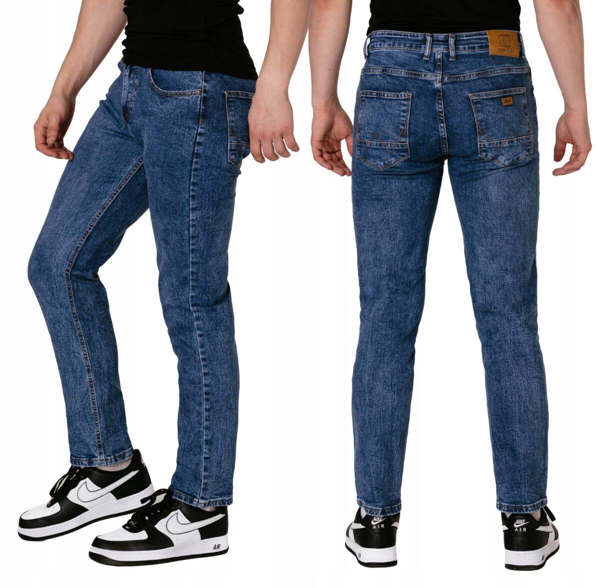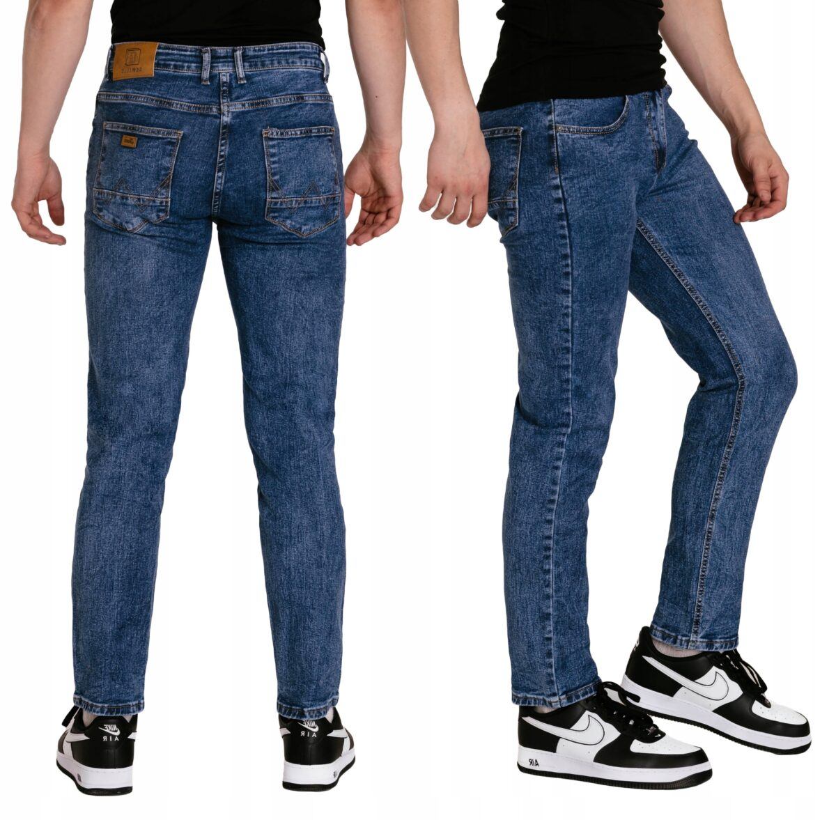 Niebieskie spodnie jeansowe ze standardowym stanem i wąską nogawką typu "rurka" to jeden z najczęściej wybieranych modeli spodni. Niesłychanie wygodne i praktyczne podczas użytkowania, wykonane z wysokiej jakości solidnej, trwałej i mocnej tkaniny bawełnianej z dodatkiem PE (stretch). Niewielki dodatek PE ( stretch) sprawia że spodnie są bardziej elastyczne, dobrze dopasowują się do sylwetki, i są bardzo komfortowe w użytkowaniu. Łatwo się je zakłada i są znacznie wygodniejsze od jeansów, które lycry nie mają. Poza tym bawełna ma tendencję do kurczenia się w praniu, dlatego stretch sprawia, że spodnie są wyjątkowo praktyczne i można je bez problemu założyć po wysuszeniu. Pozwalają na pełną swobodę ruchów, co daje wygodę przy siadaniu i zapewnia ogromny komfort noszenia. Zapinane na kryty zamek błyskawiczny i metalowy guzik sygnowany logiem firmy. Z przodu mają dwie zaokrąglone kieszonki oraz jedną mniejszą tzw. bilonówkę, a na tyle klasyczne naszywane kieszenie jak w typowych spodniach jeansowych. Najbardziej podatne na uszkodzenia miejsca wzmocnione są dodatkowymi przeszyciami oraz metalowymi nitami. W pasie szlufki umożliwiające stylizacje z paskiem.
