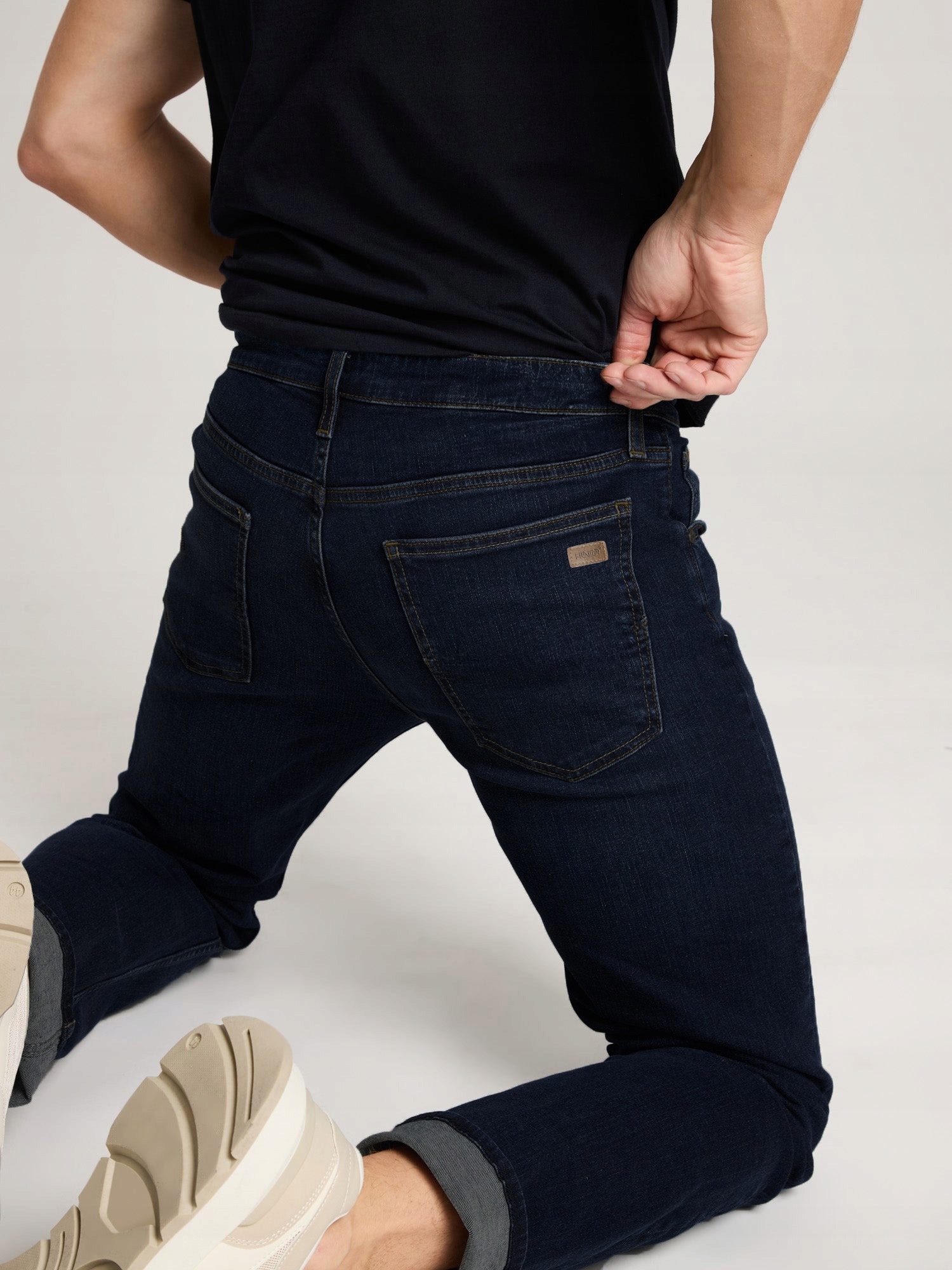 - Naszywka z logo firmy i typowe dla spodni jeansowych mocne, podwójne przeszycia
