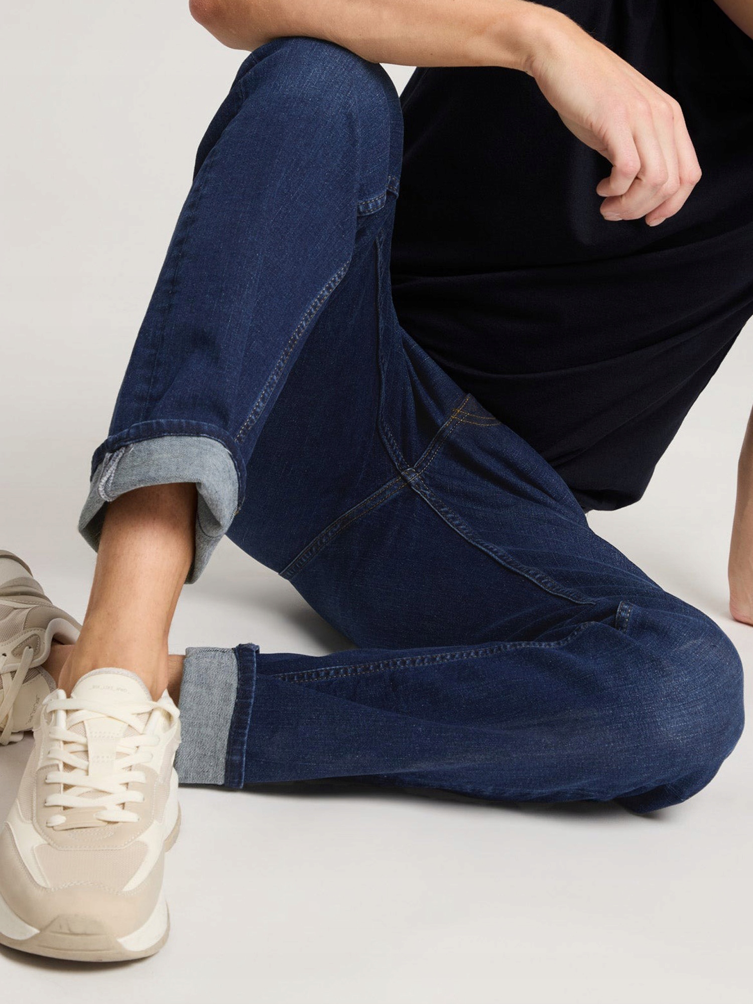 Klasyczne i ponadczasowe spodnie męskie jeansowe model 211/1#, umiarkowanie swobodne w biodrach, o prostych, smukłych nogawkach to jeden z najczęściej wybieranych przez mężczyzn modeli spodni. Wykonane z wysokiej jakości sprężystej, trwałej i mocnej tkaniny jeansowej w ciemnym kolorze granatowy ,,Dark Blue Denim" dzięki niewielkiemu dodatkowi elastanu (stretch) wyjątkowo wygodnej w użytkowaniu. Niewielki dodatek elastanu sprawia że spodnie są bardziej elastyczne, dobrze dopasowują się do sylwetki, i są bardzo komfortowe w użytkowaniu. Łatwo się je zakłada i są znacznie wygodniejsze od jeansów, które elastanu nie mają. Poza tym bawełna ma tendencję do kurczenia się w praniu, dlatego elastan sprawia, że spodnie są wyjątkowo praktyczne i można je bez problemu założyć po wysuszeniu. Pozwalają na pełną swobodę ruchów, co daje wygodę przy siadaniu i zapewnia ogromny komfort noszenia. Zapinane na kryty zamek błyskawiczny i metalowy guzik sygnowany logiem firmy. Z przodu mają dwie zaokrąglone kieszonki oraz jedną mniejszą tzw. bilonówkę, a na tyle klasyczne naszywane kieszenie jak w typowych spodniach jeansowych. Najbardziej podatne na uszkodzenia miejsca wzmocnione są podwójnymi przeszyciami oraz metalowymi nitami. W pasie szlufki umożliwiające stylizacje z paskiem.